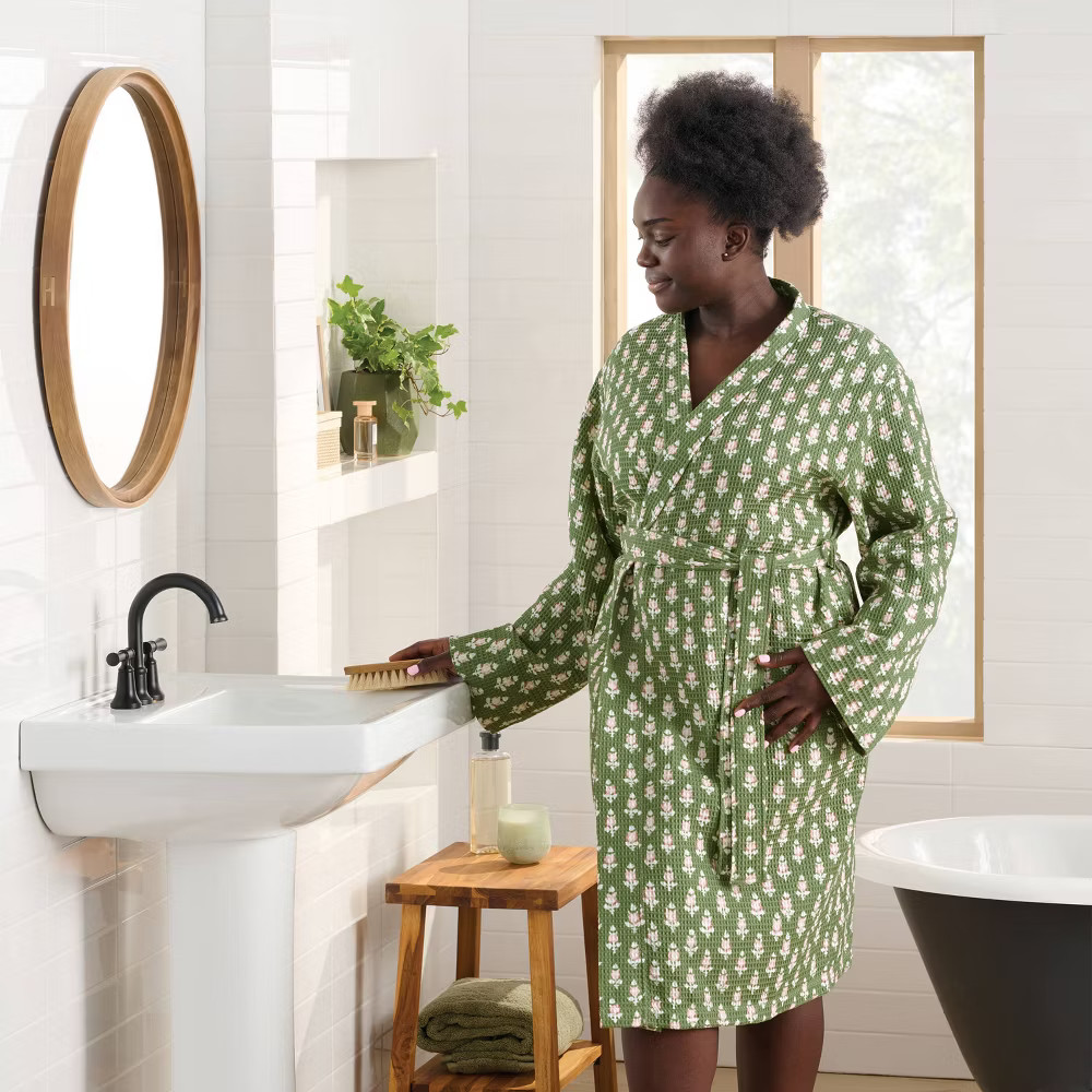 как выглядит L/XL Floral Waffle Bath Robe Green/Pink - Threshold фото