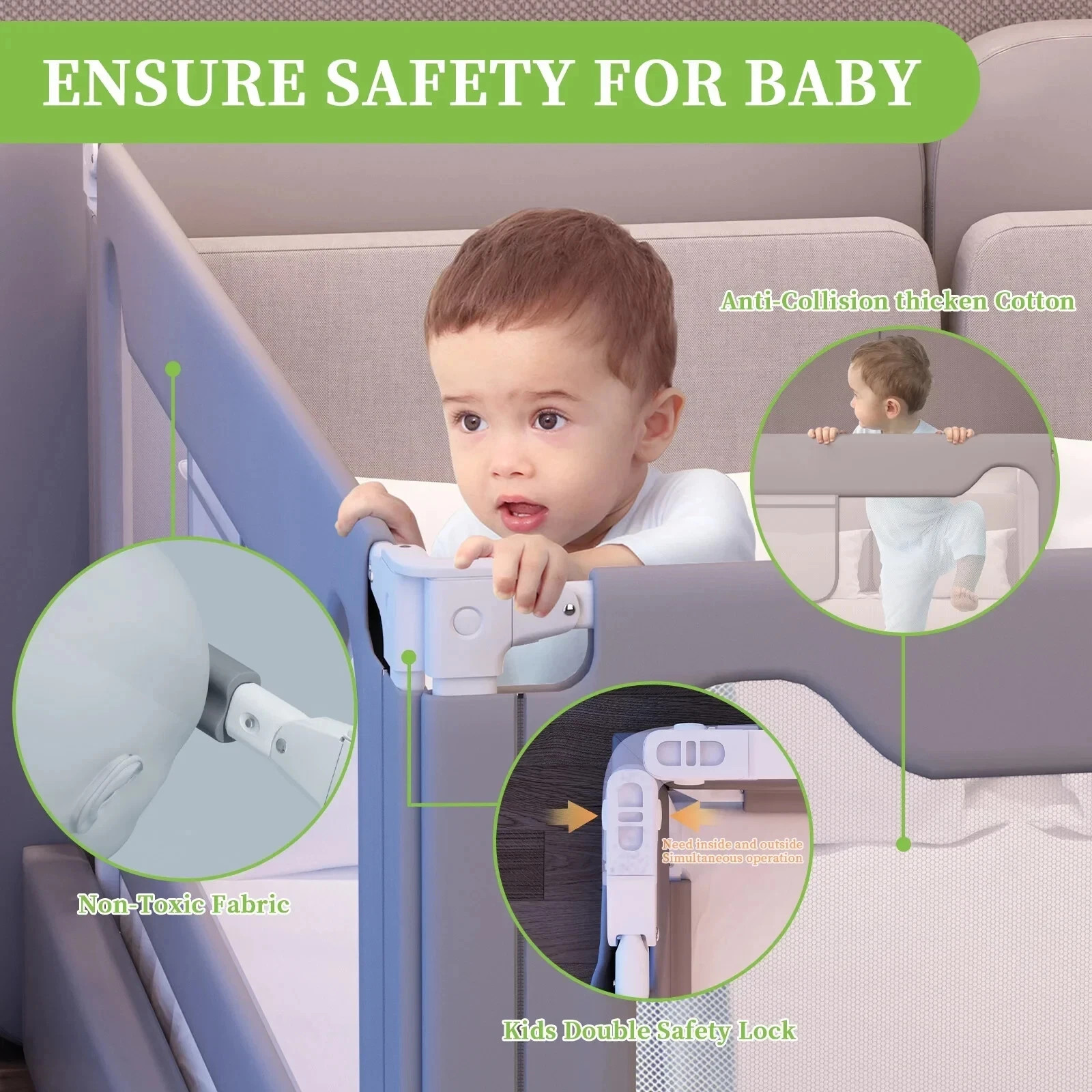 Toddler Bed Rail 2 meters Gray w/Double Child Lock, Adjustable Height 28.3