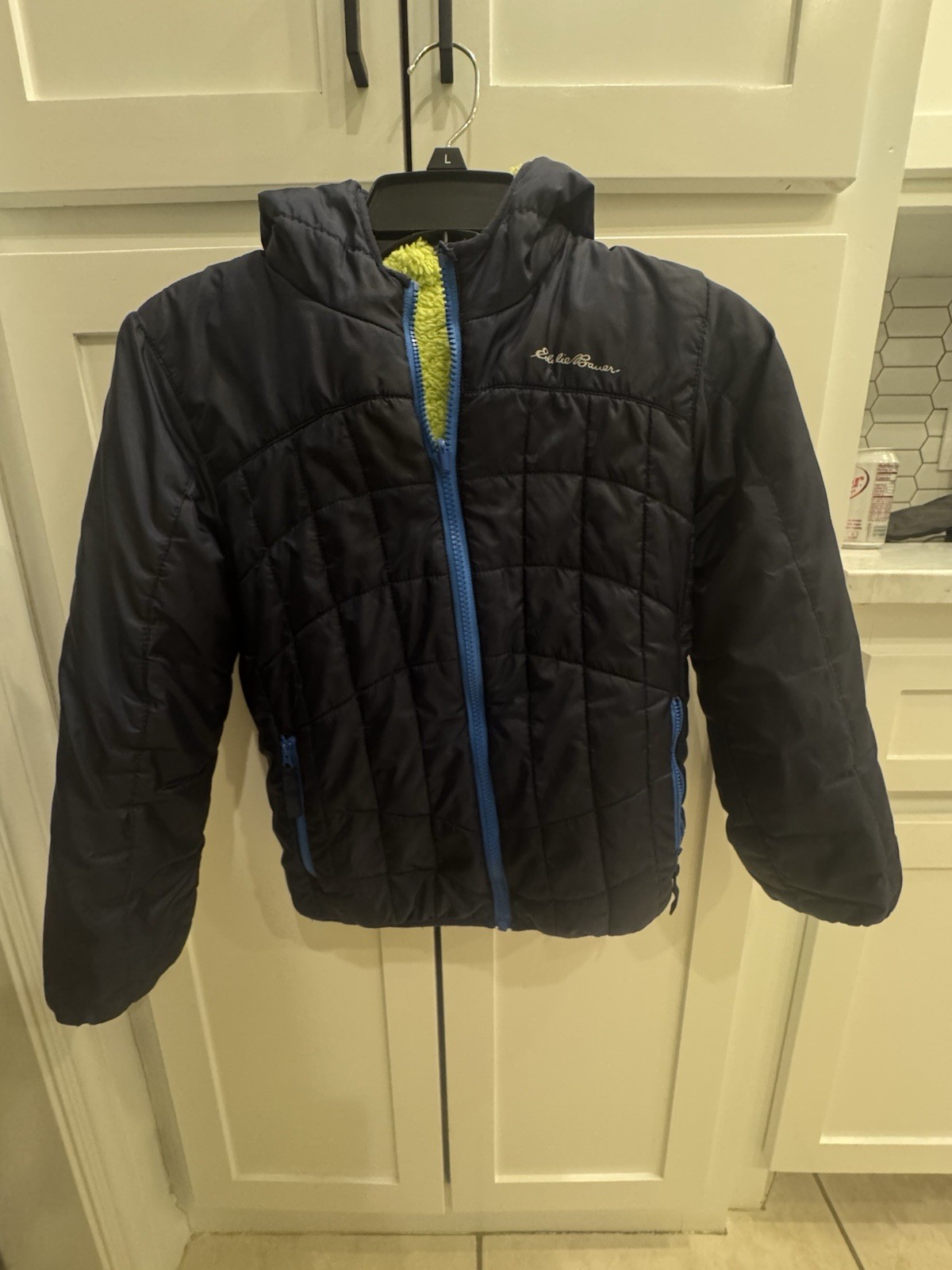 как выглядит Eddie Bauer Kids 7/8 Small Reversible Hooded Puffer Jacket Blue Green S 8 фото