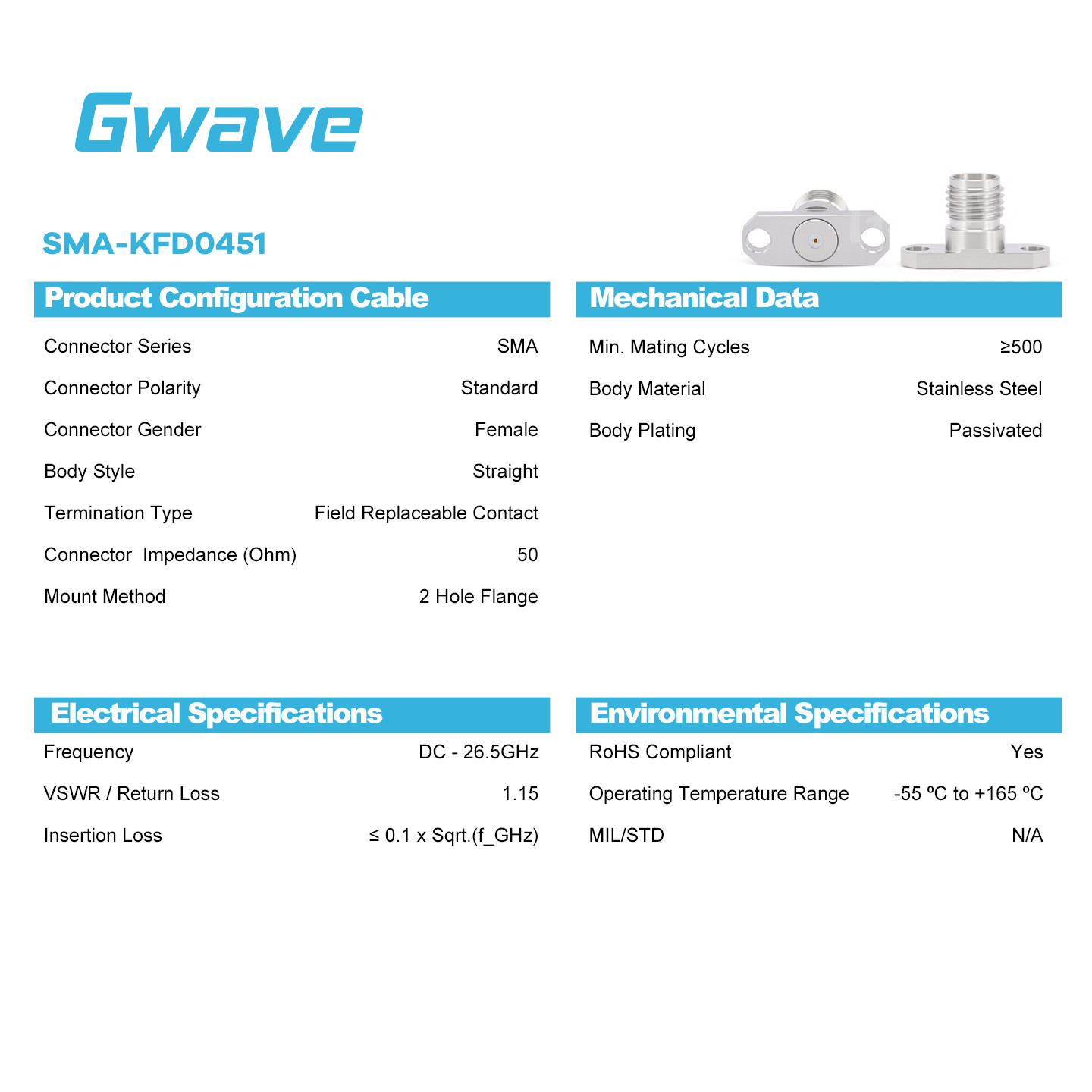 SMA Female Connector, 2 Hole Flange,Hole Spacing 12.2mm,Pin Dia 0.51mm, DC-26.5G