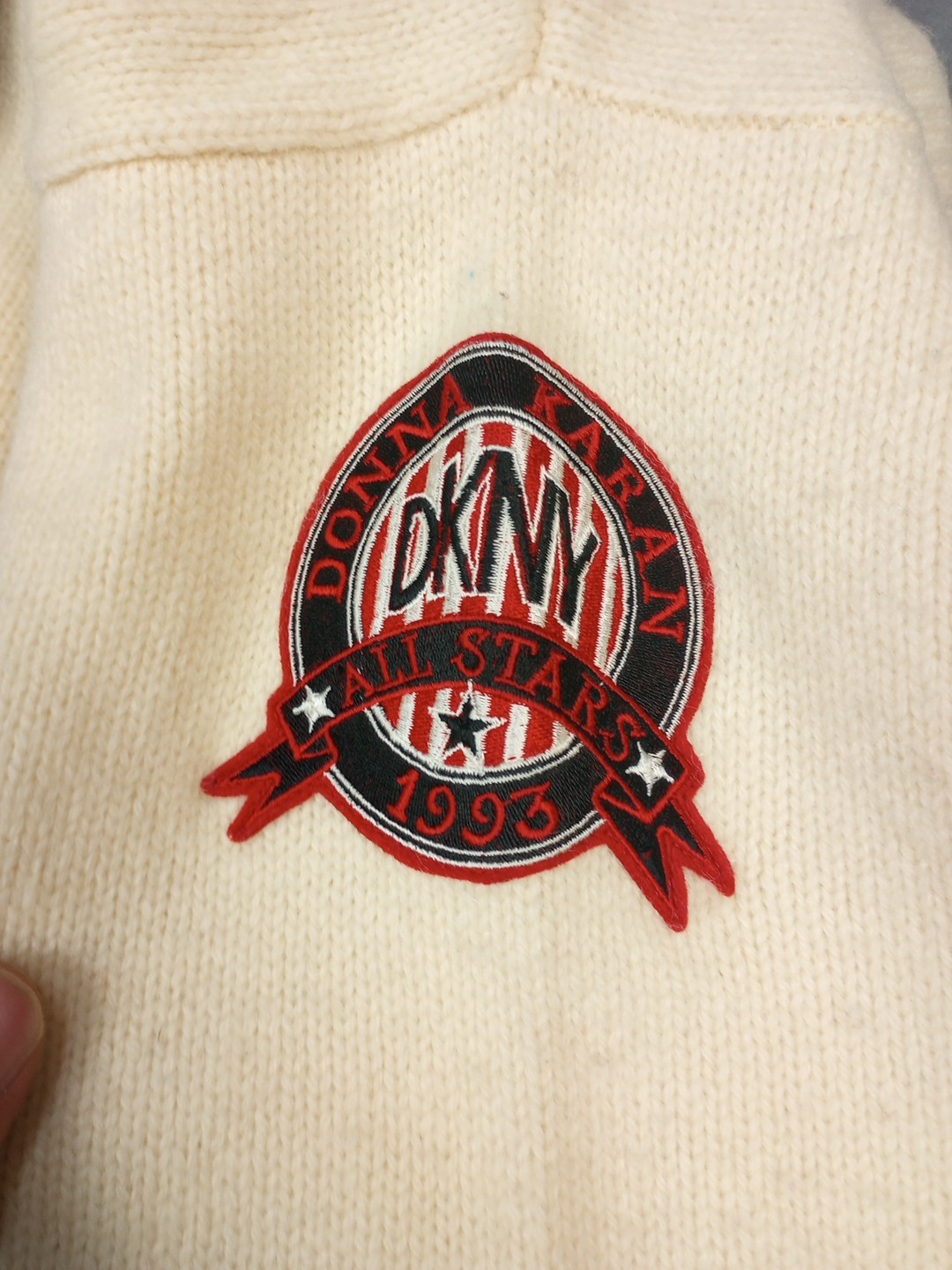 как выглядит DKNY JEANS Letterman Varsity Cardigan Sweater Off White 100 Wool Size Medium фото