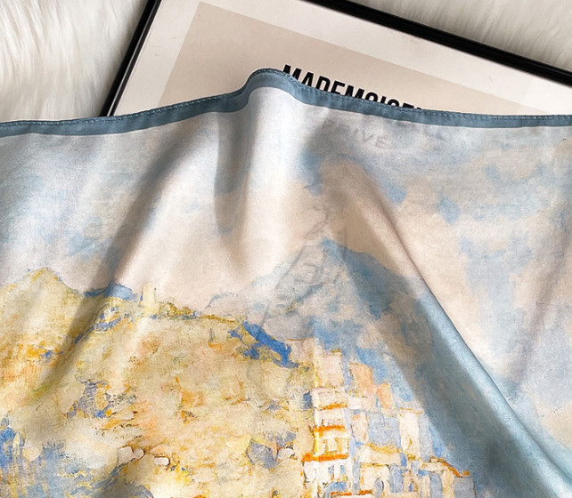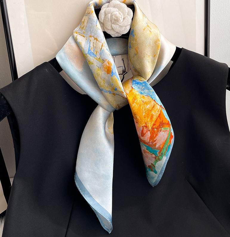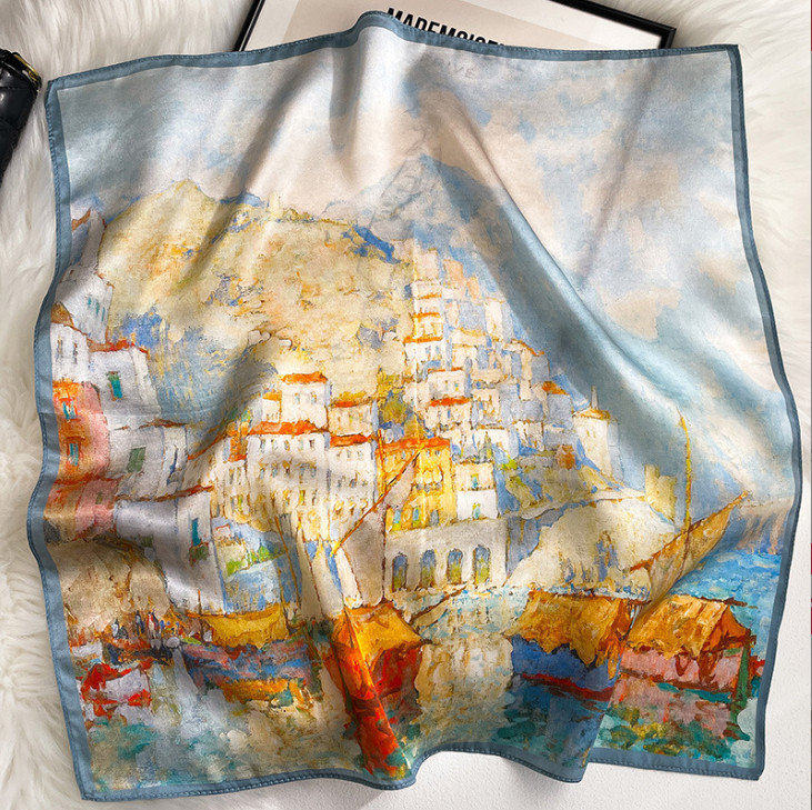 100 Mulberry Silk Scarf 53X53cm Women Square Bandana Wrap Oil Painting Town
