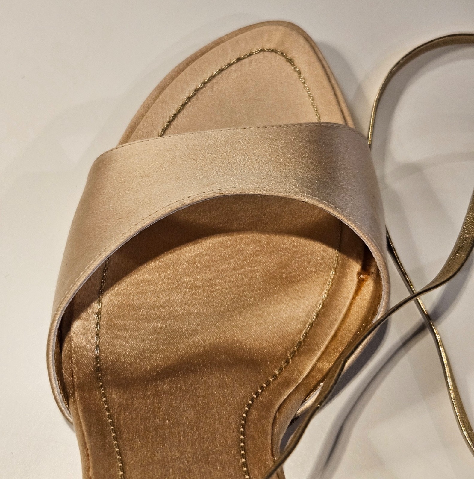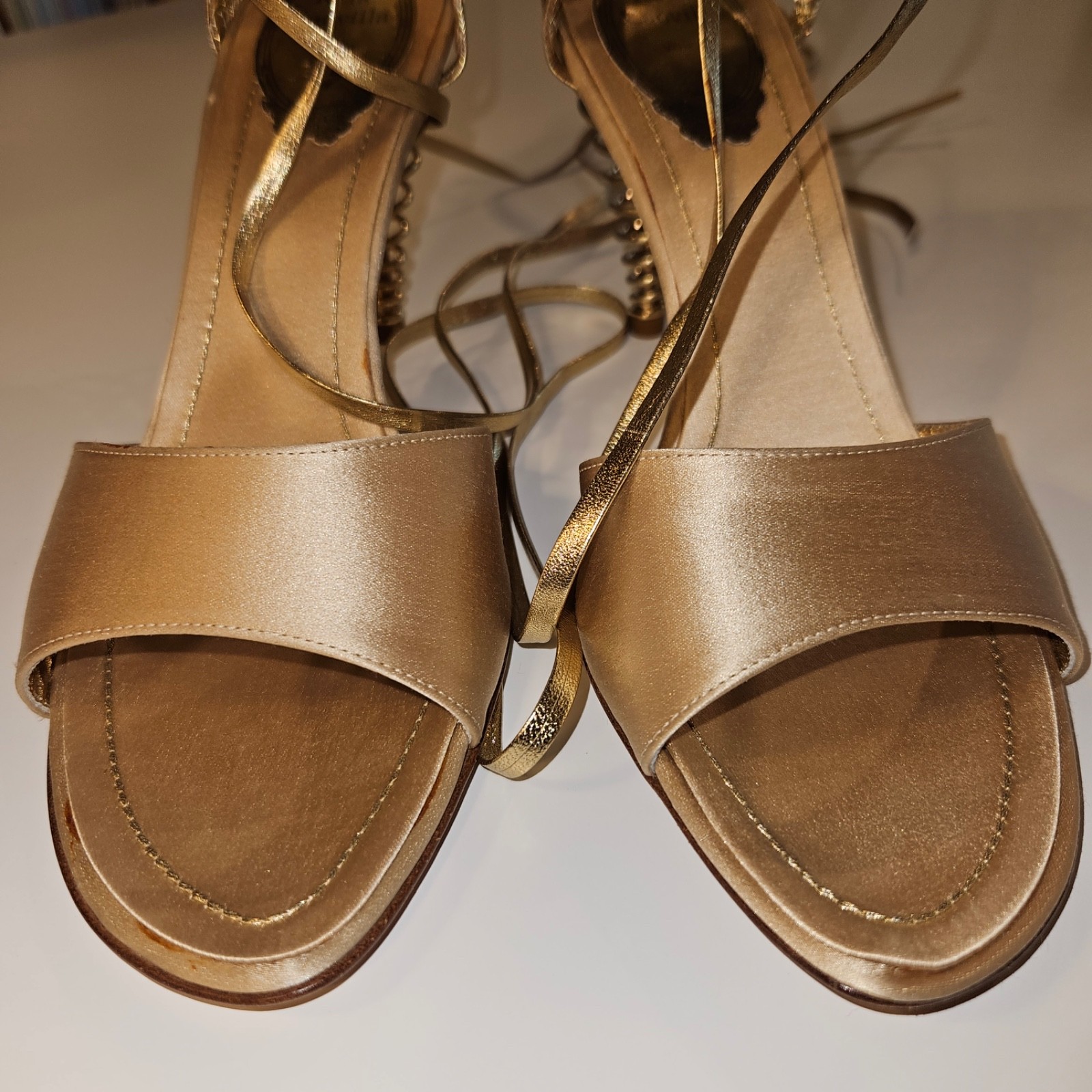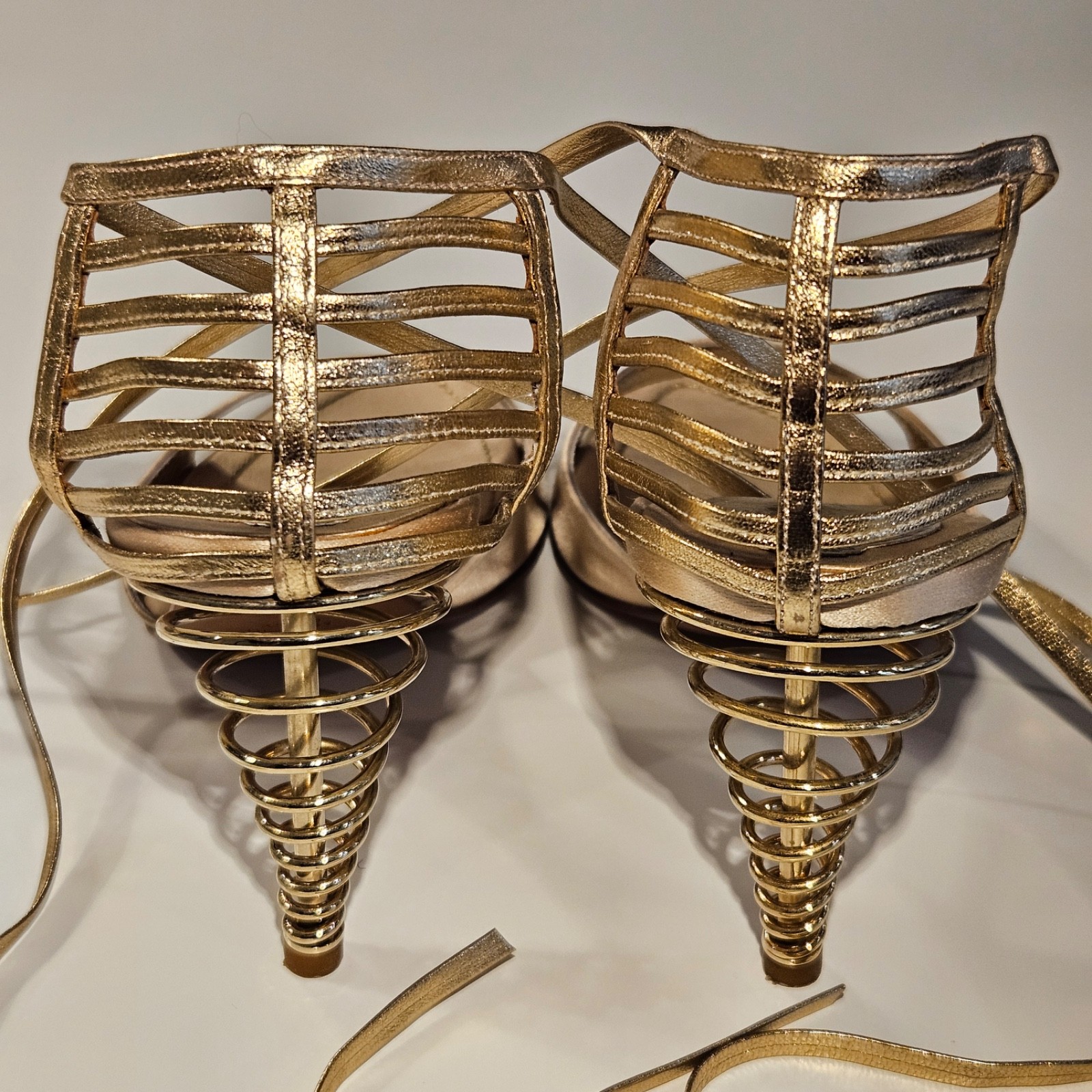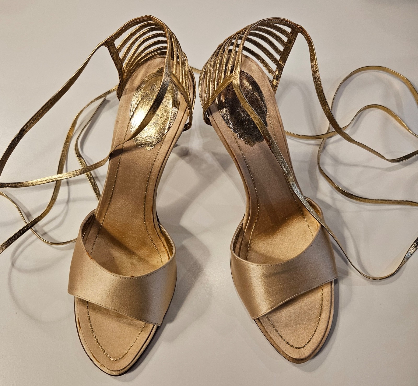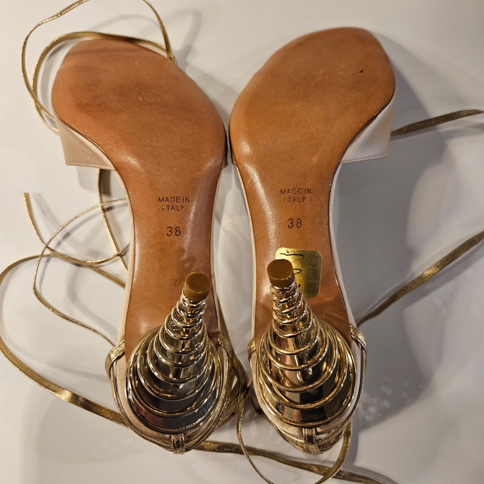 как выглядит Rene Caovilla rare champagne satin sandals, gold spiral heel, IT38 New with box фото