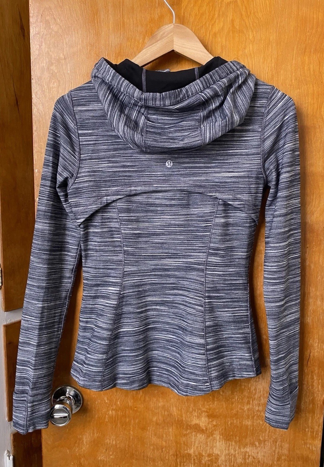 как выглядит Lululemon Hooded Define Jacket Nulu Size 8 Heathered Gray Black Stripe фото