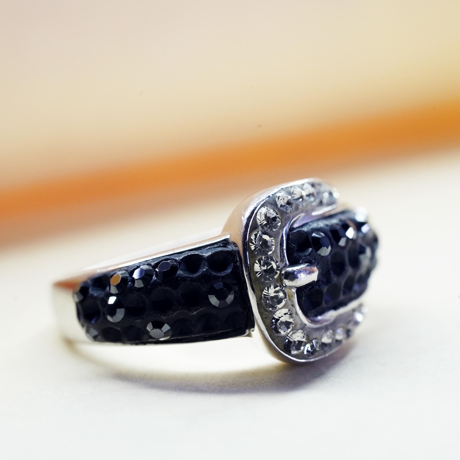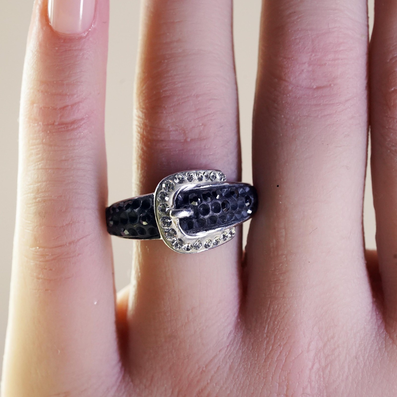 как выглядит Size 8, Signed AU two tone Sterling silver 925 silver belt ring with cluster cz фото
