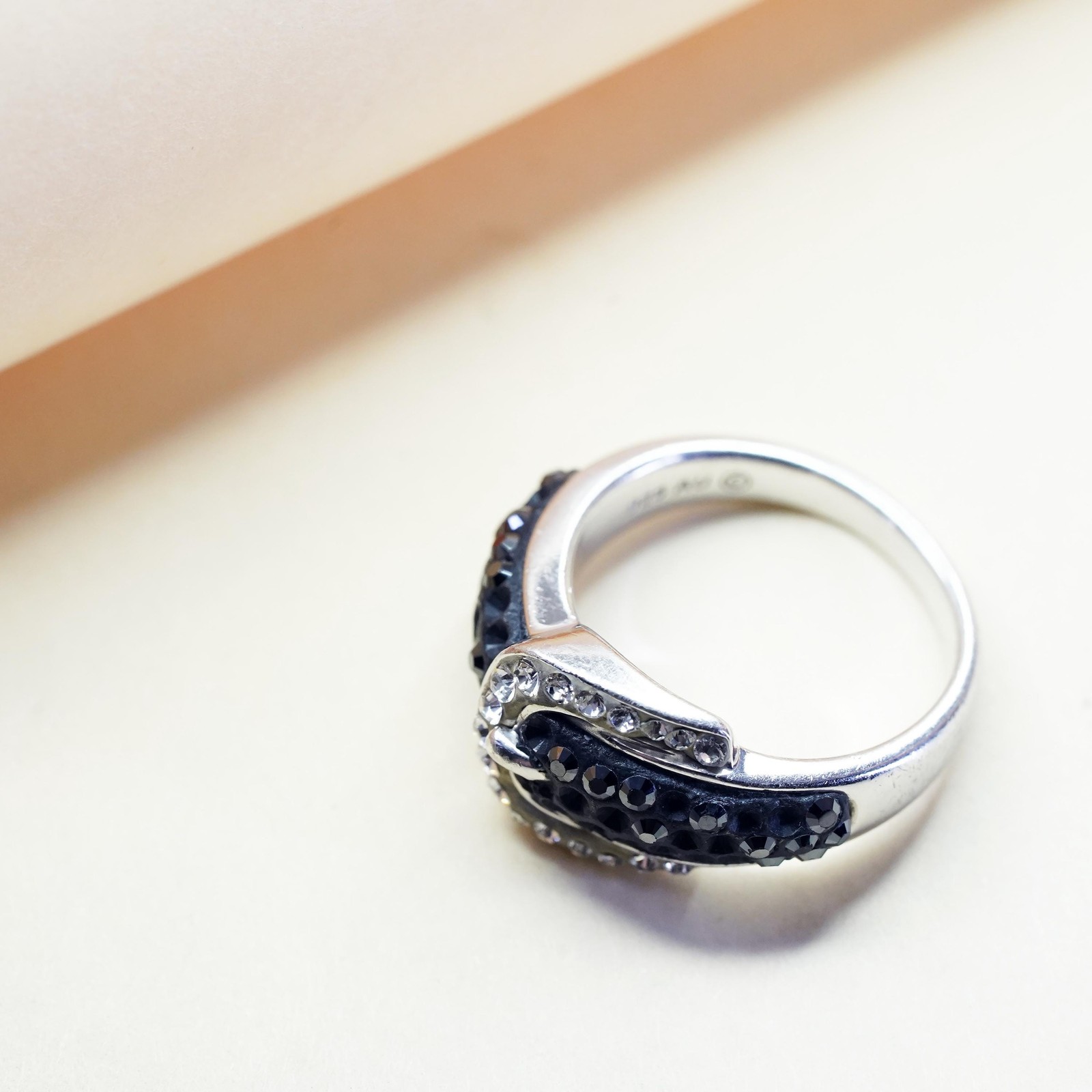 Size 8, Signed AU two tone Sterling silver 925 silver belt ring with cluster cz