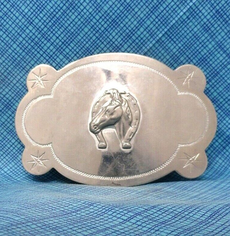 Western Horse Horseshoe Belt Buckle Cowboy Nickel Plate Cowgirl Vtg 80s .TWY606
