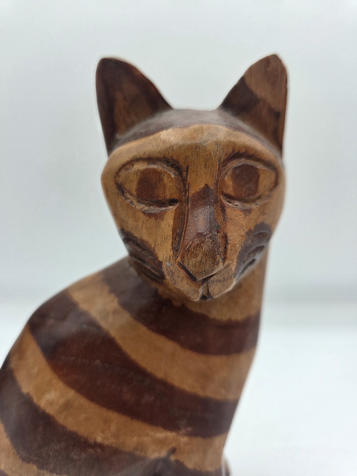 • Hand Carved Wooden Cat Figurine Striped Minimalist Folk Art Home Decor 7" X 5"