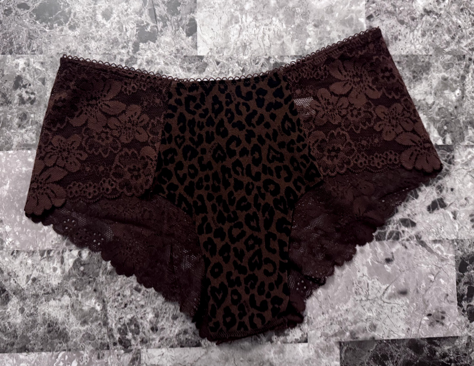 как выглядит VICTORIAS SECRET PINK BROWN BLACK LEOPARD FLORAL LACE NO SHOW CHEEKY PANTIES фото