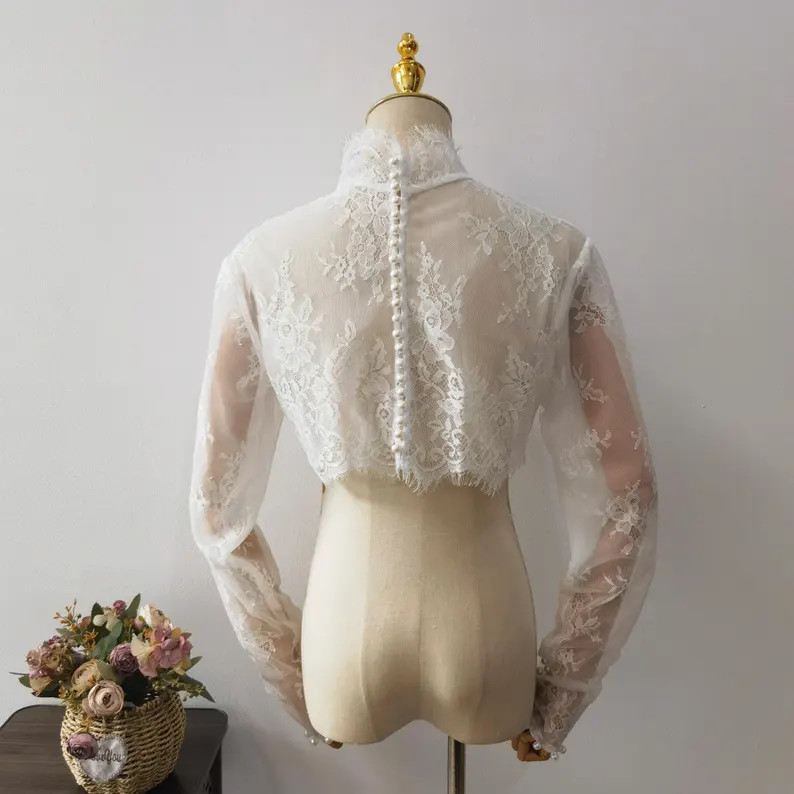 Lace Appliques Wedding Long Sleeves Bride Jacket High Neck Bridal Boleros