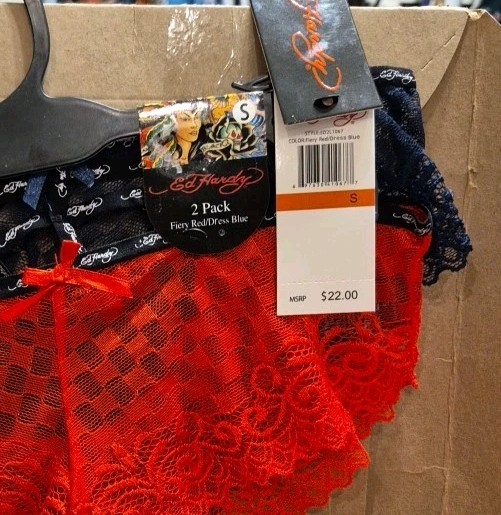как выглядит 2 Pack Ed Hardy Lace Panties Size Small, Fiery Red Dress Blue, NWT фото