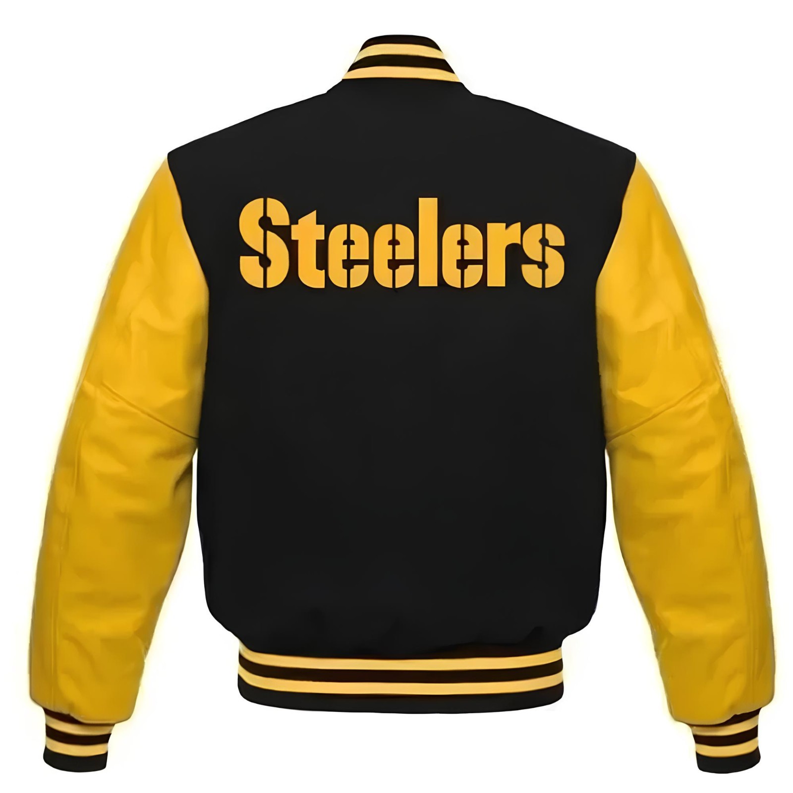 Pittsburgh Steelers Black Body Golden Leather Sleeves Varsity Jacket Men Size L
