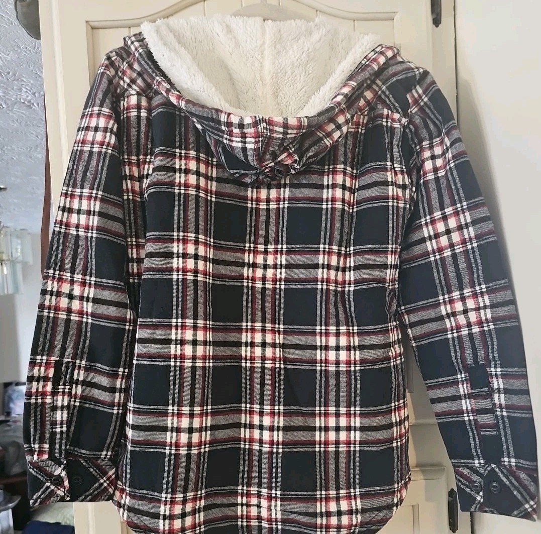 как выглядит Boston Traders Sherpa Lined Hooded Flannel Shacket Womens S Black Plaid NWT NICE фото