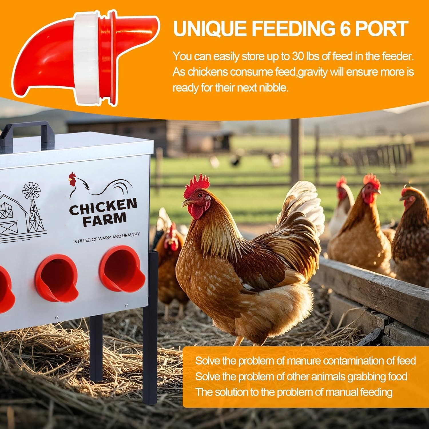 Automatic Chicken Feeder Box 30 lbs, 6 Feeding Ports, No Waste Poultry Feeder