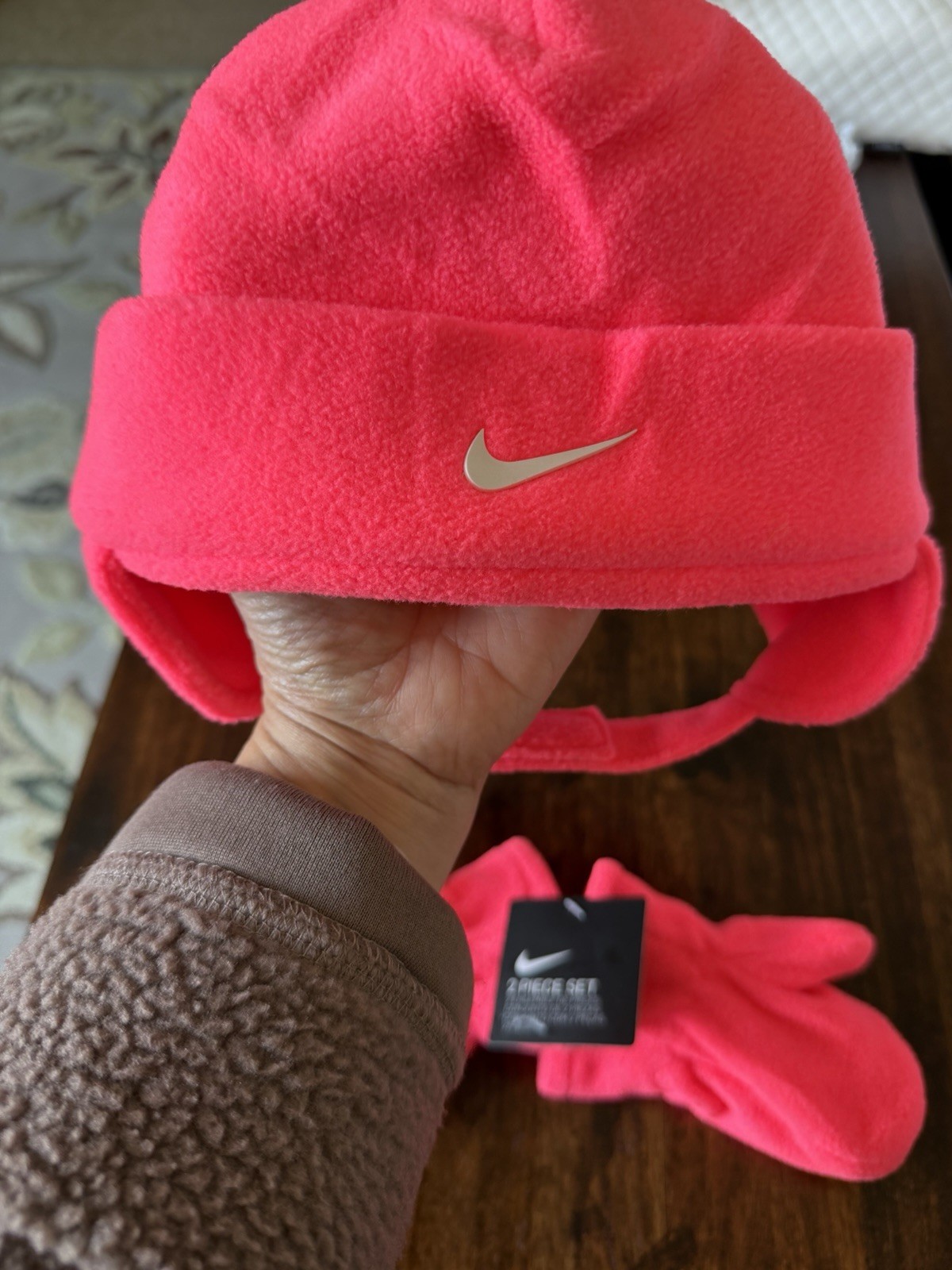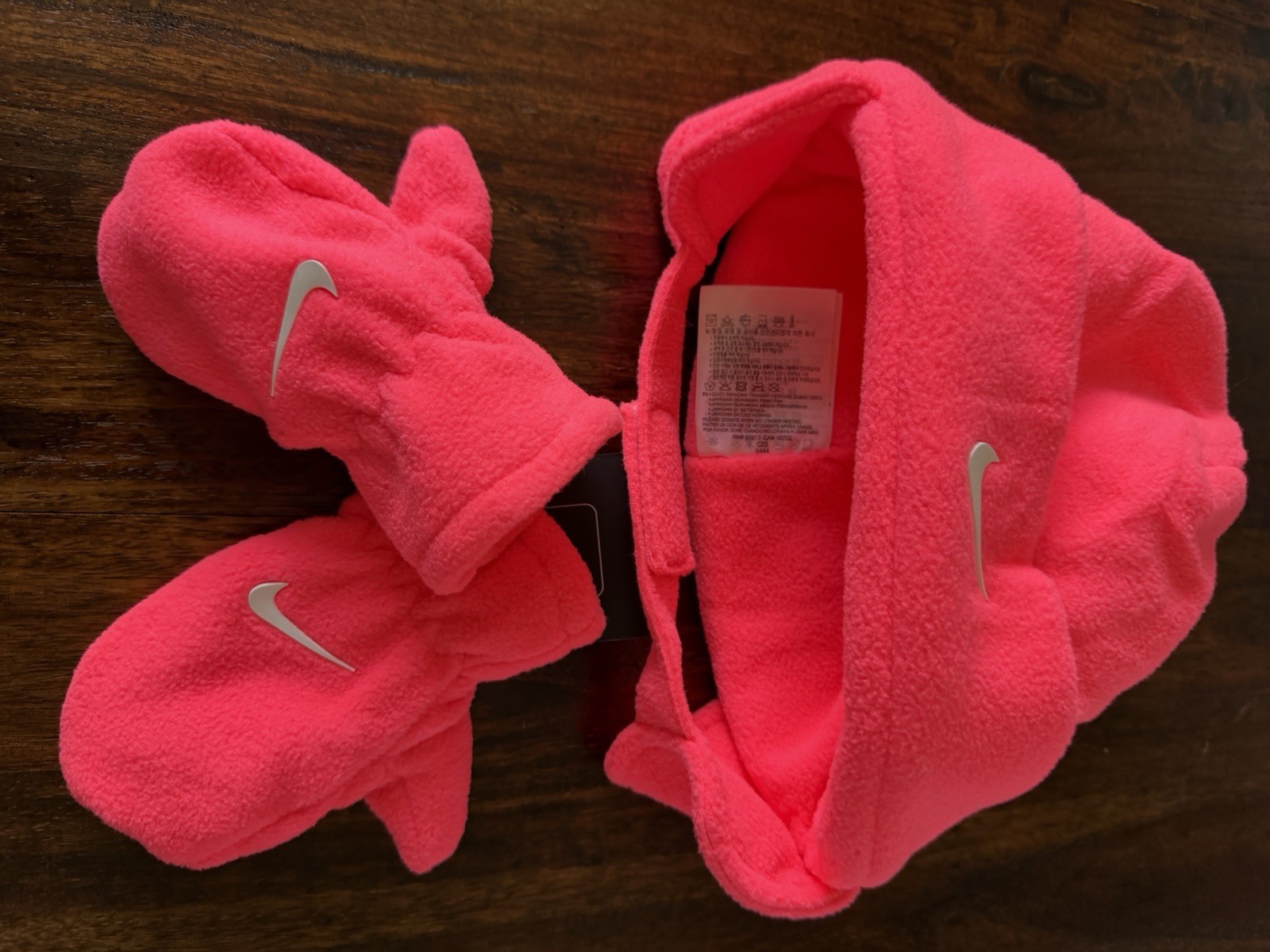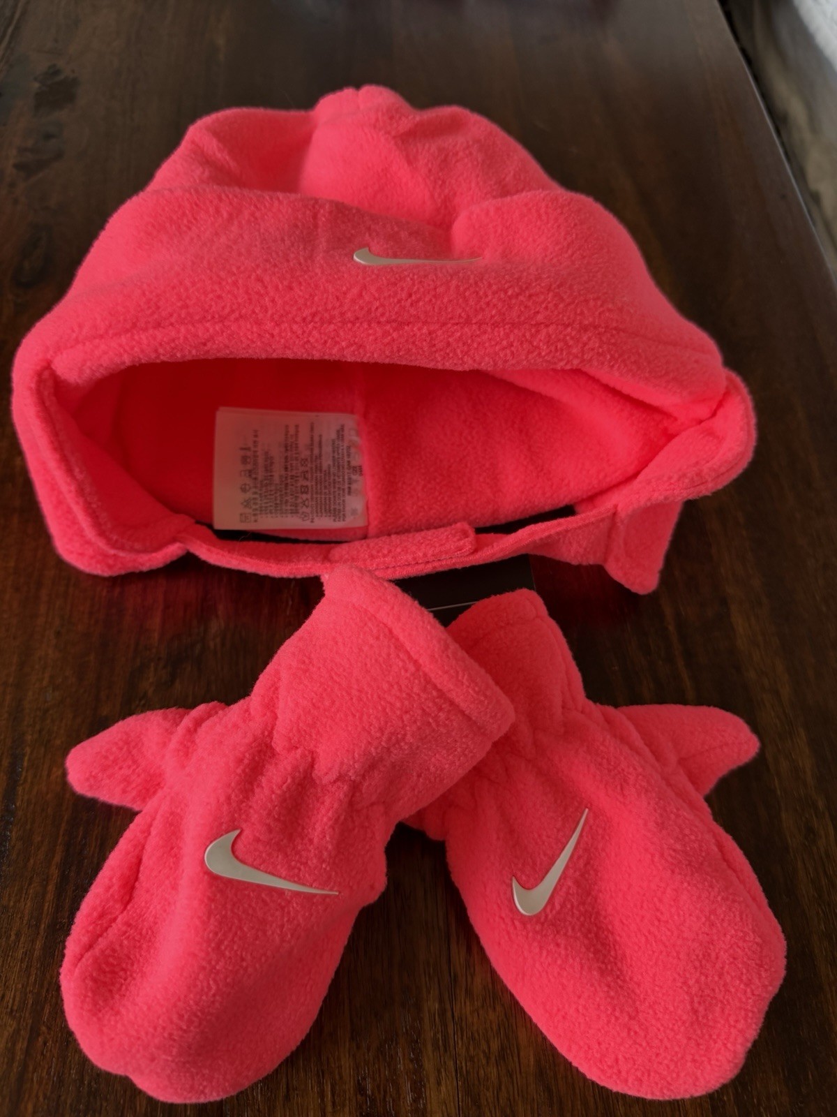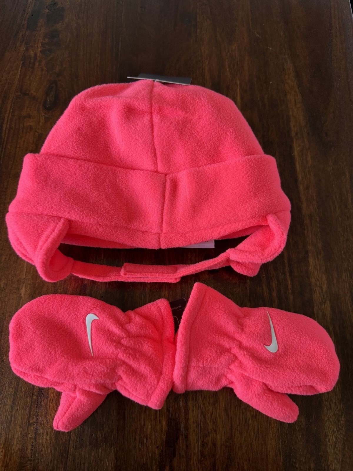 Nike Toddler Fleece Chin Strap Trapper Hat Mittens 2 Piece Set Racer Pink 2-4T
