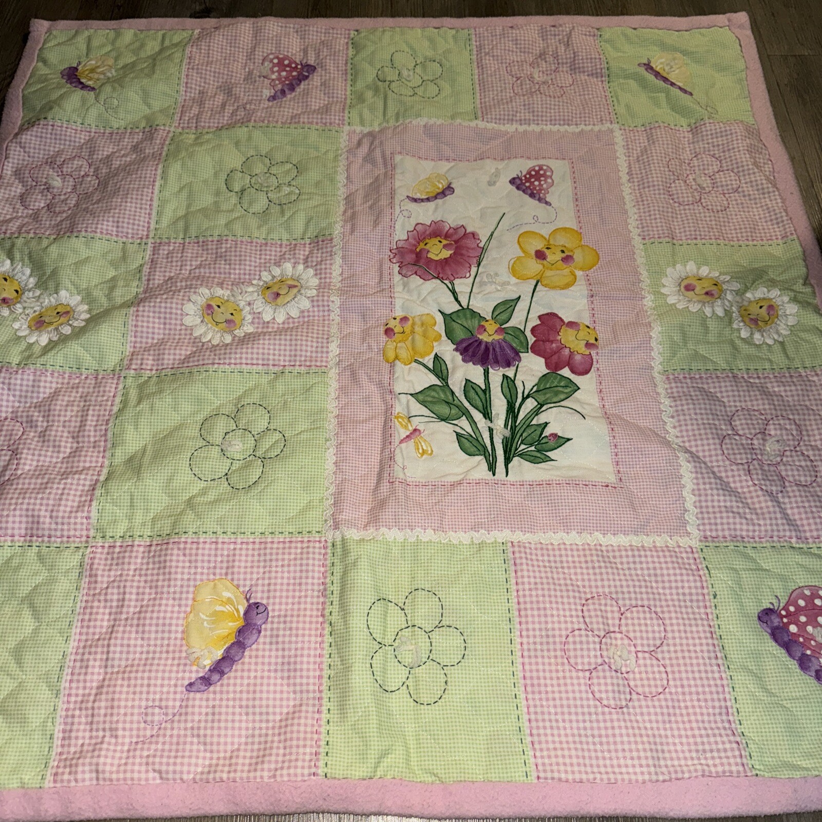 Vintage Daisy Kingdom Crib Nursery Quilt Baby Pink Daisy Flowers Butterfly 44x44