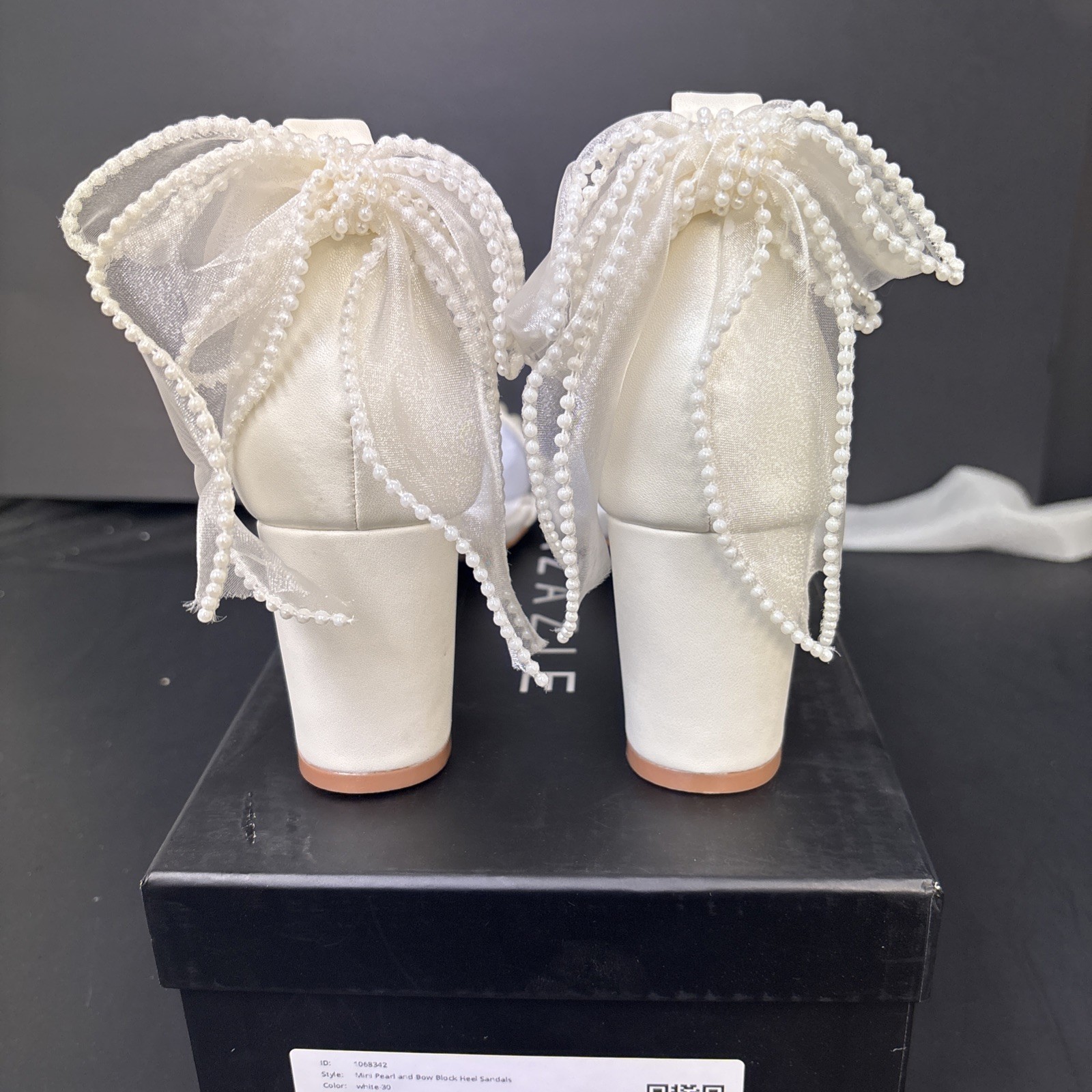Azazie White Block Heel Sandals with Pearls And Bow Sz 10 NWB