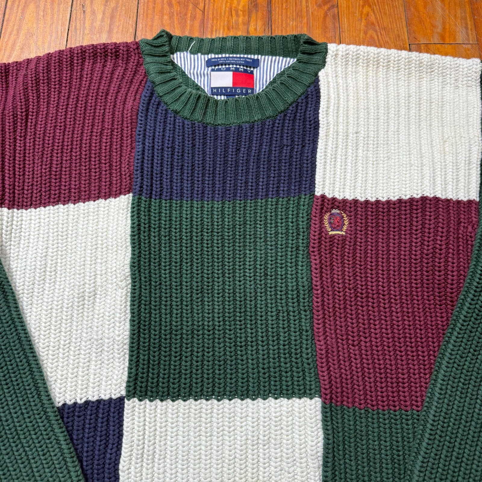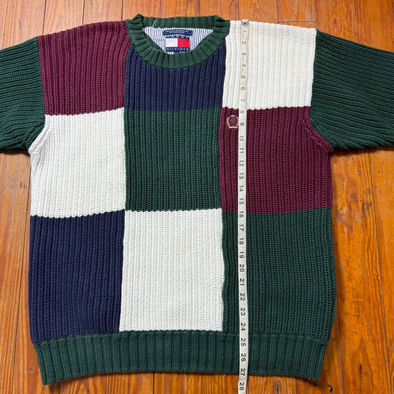 как выглядит Vintage Tommy Hilfiger Heavy Knit Sweater Mens Medium Color Block Crest Logo фото