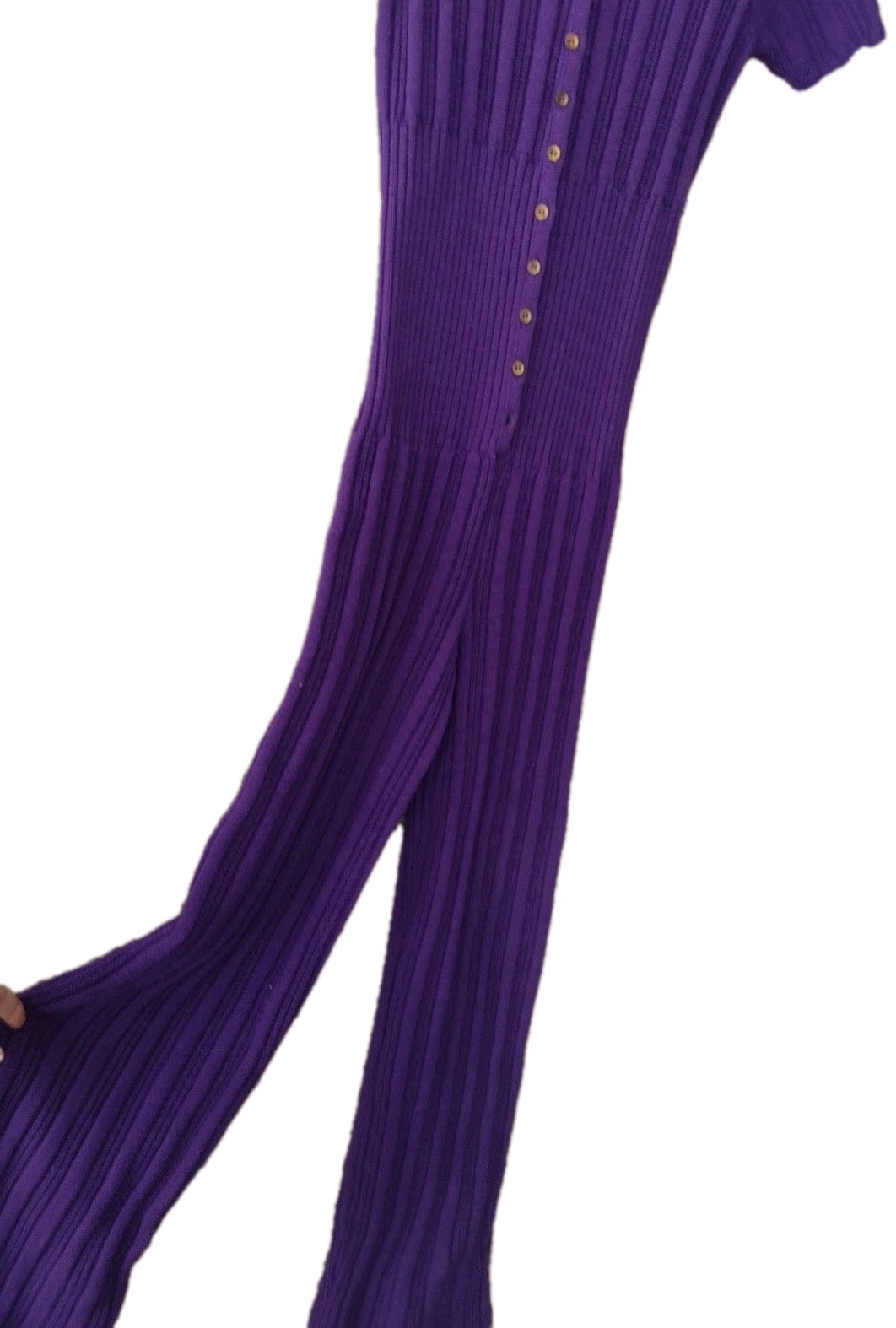 Rare Vintage 70s Jane Irwill Knit Jumpsuit Purple Ribbed Stretch Gold Button M