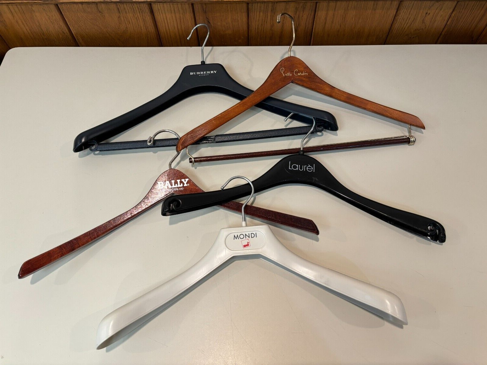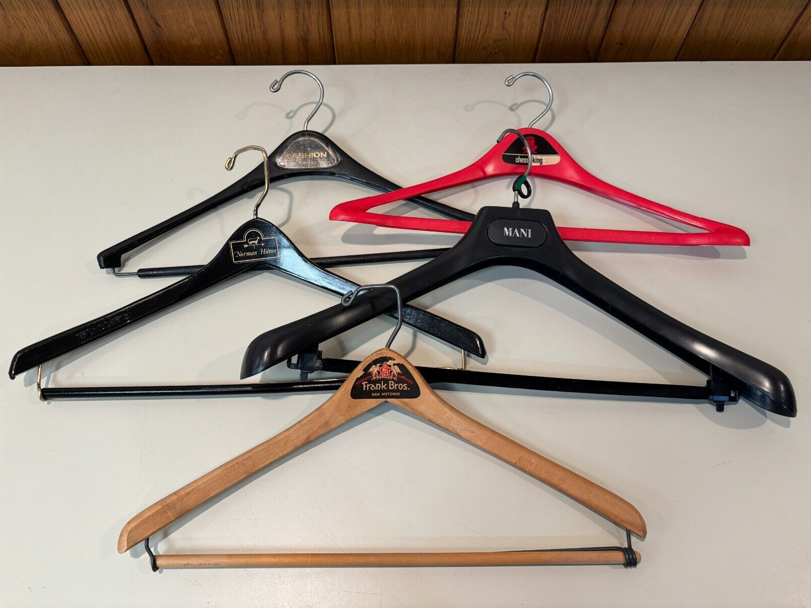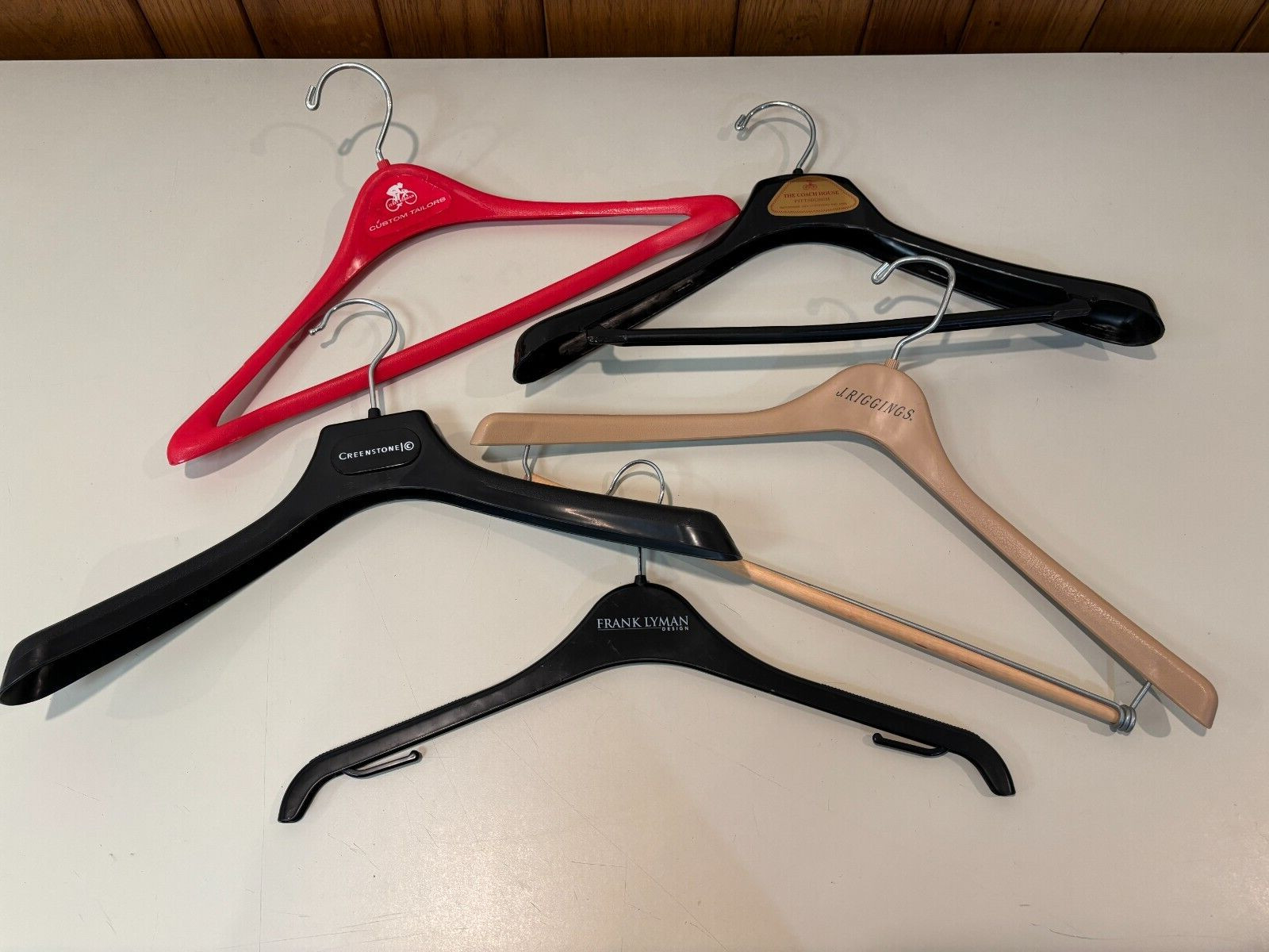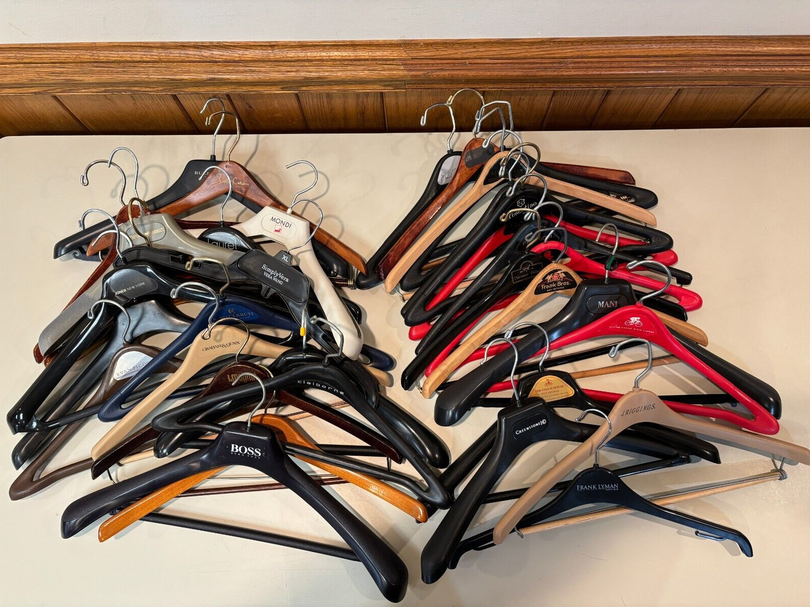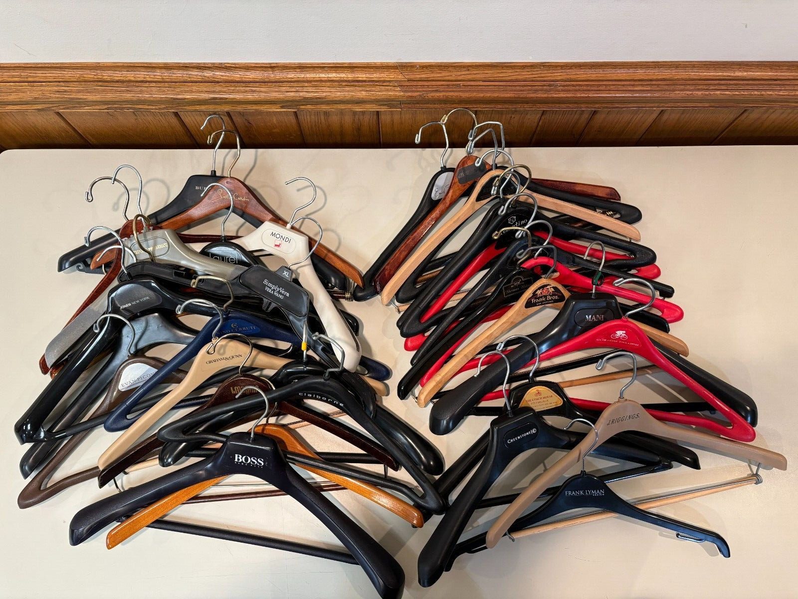 как выглядит Lot of 35 Vintage Designer and Clothing Store Plastic Wooden Hangers фото