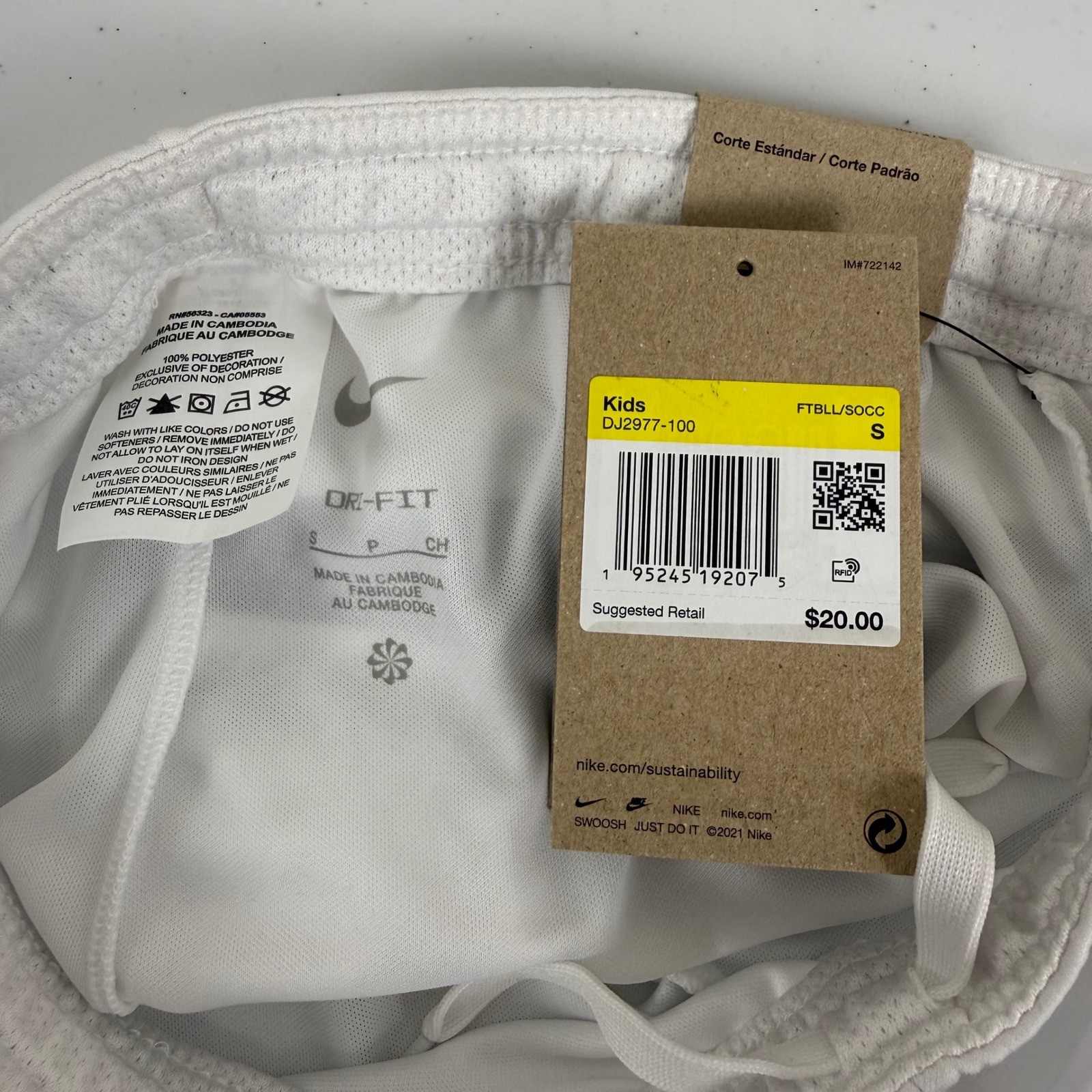 Nike Kids Dri FIT Soccer Shorts White Black Logo Athletic Performance Size S NEW