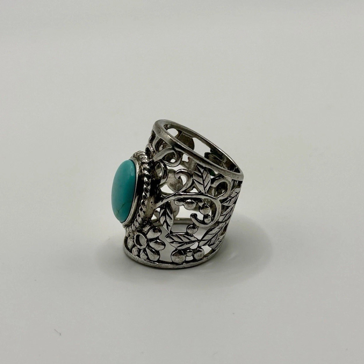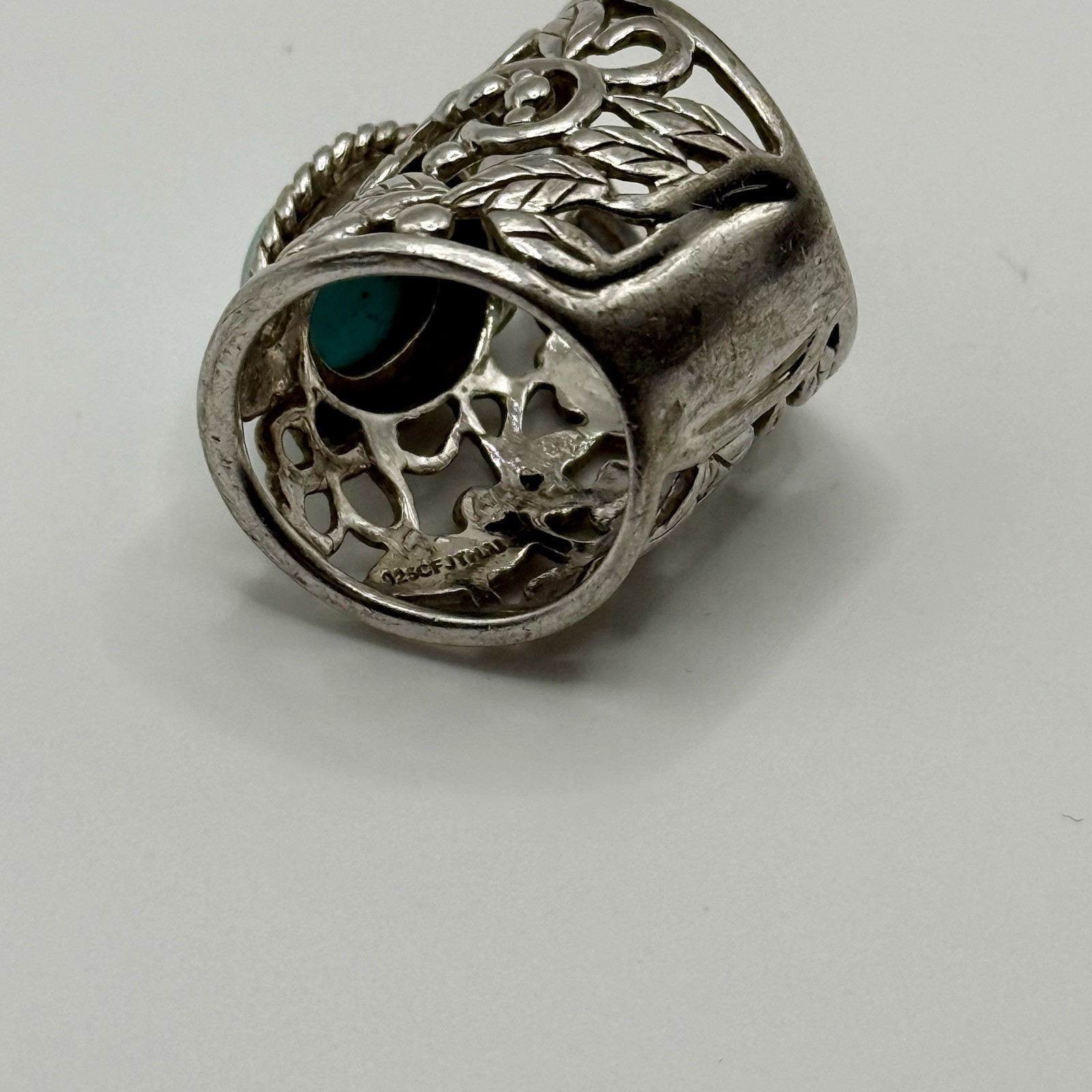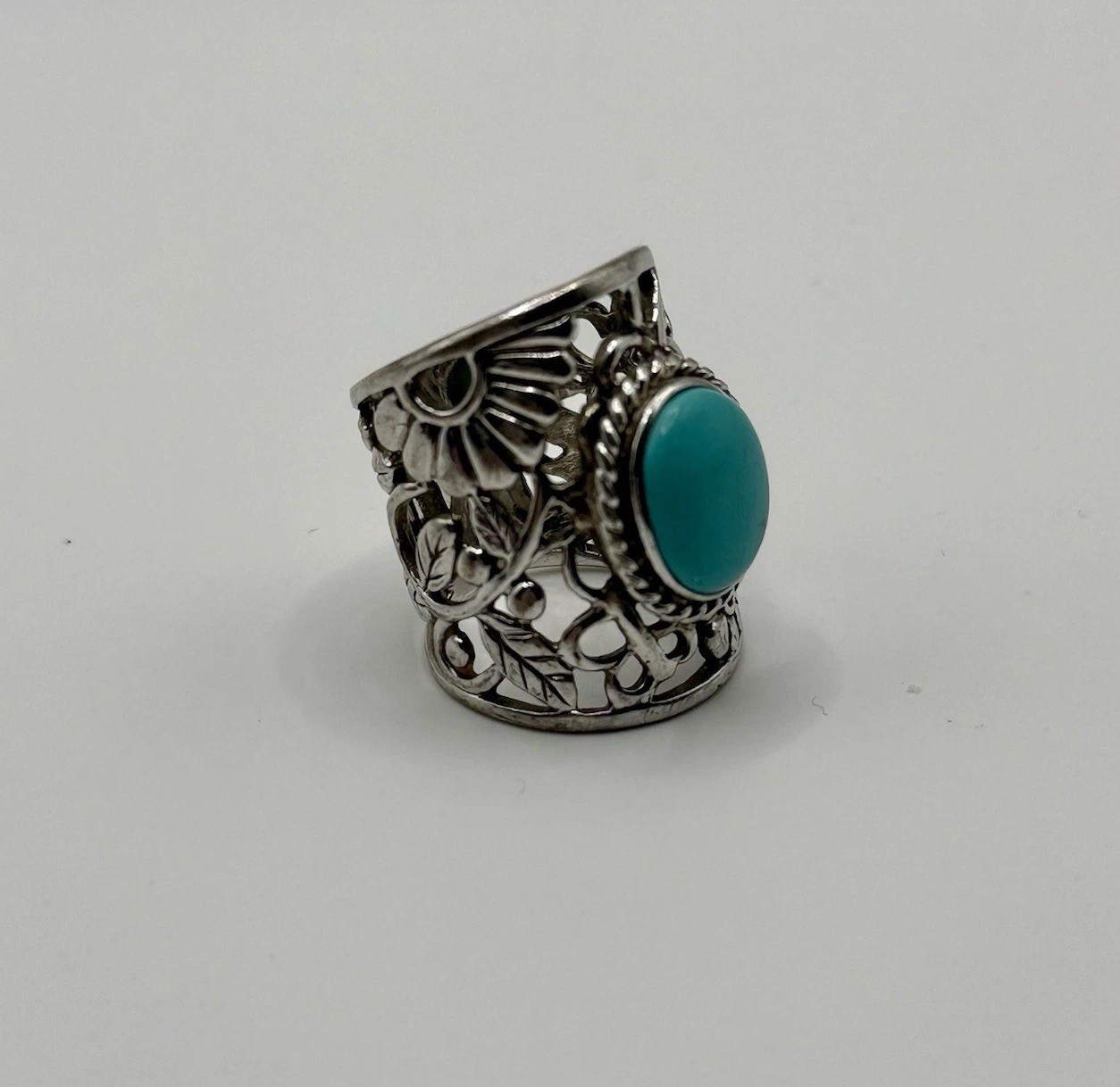 как выглядит CFJ Thai 925 Sterling Silver Turquoise Ring Floral Filigree Boho Wide Band 7.5 фото