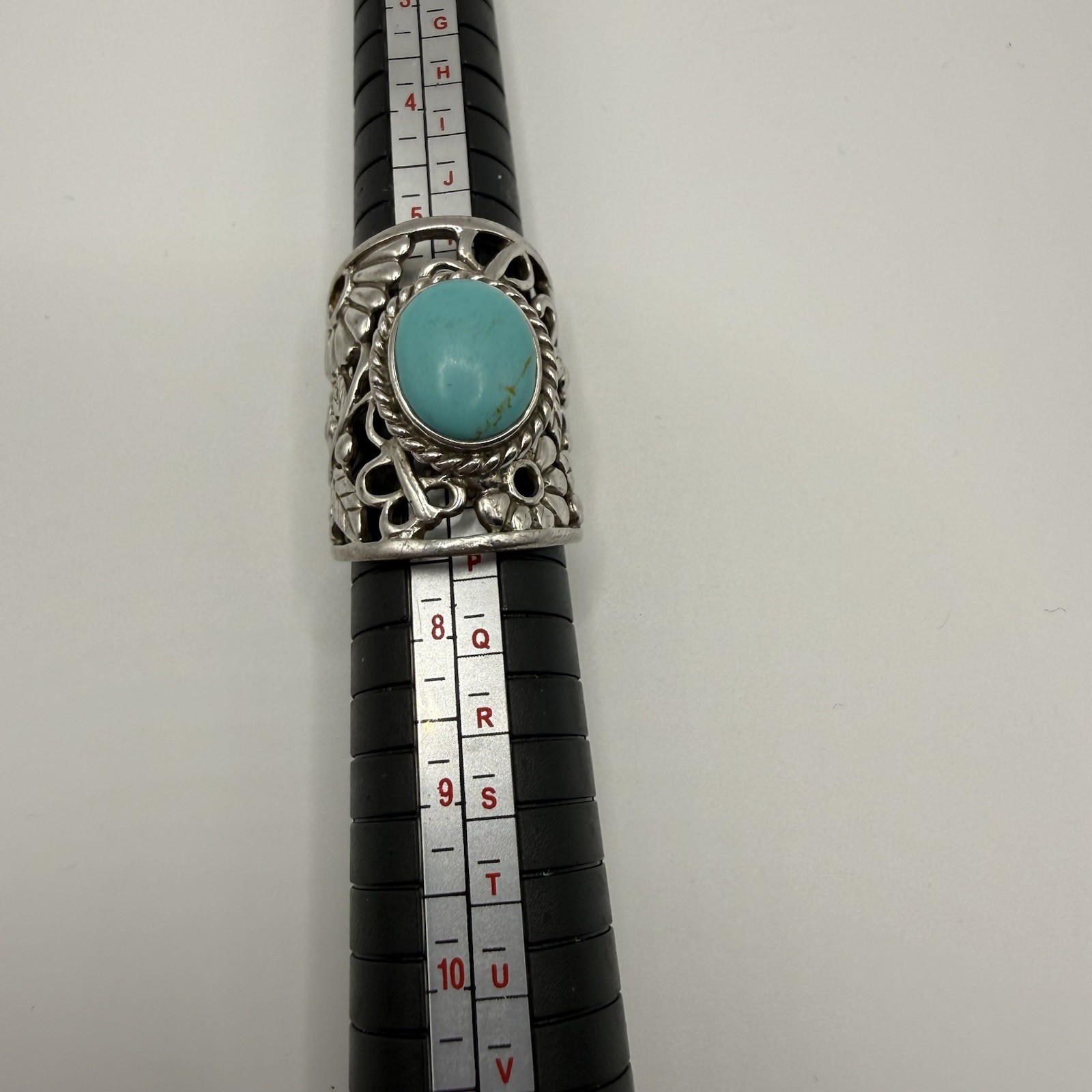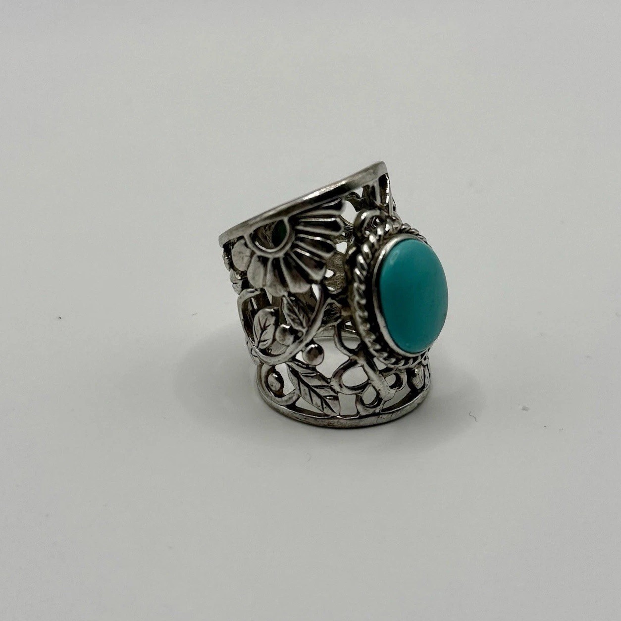CFJ Thai 925 Sterling Silver Turquoise Ring Floral Filigree Boho Wide Band 7.5