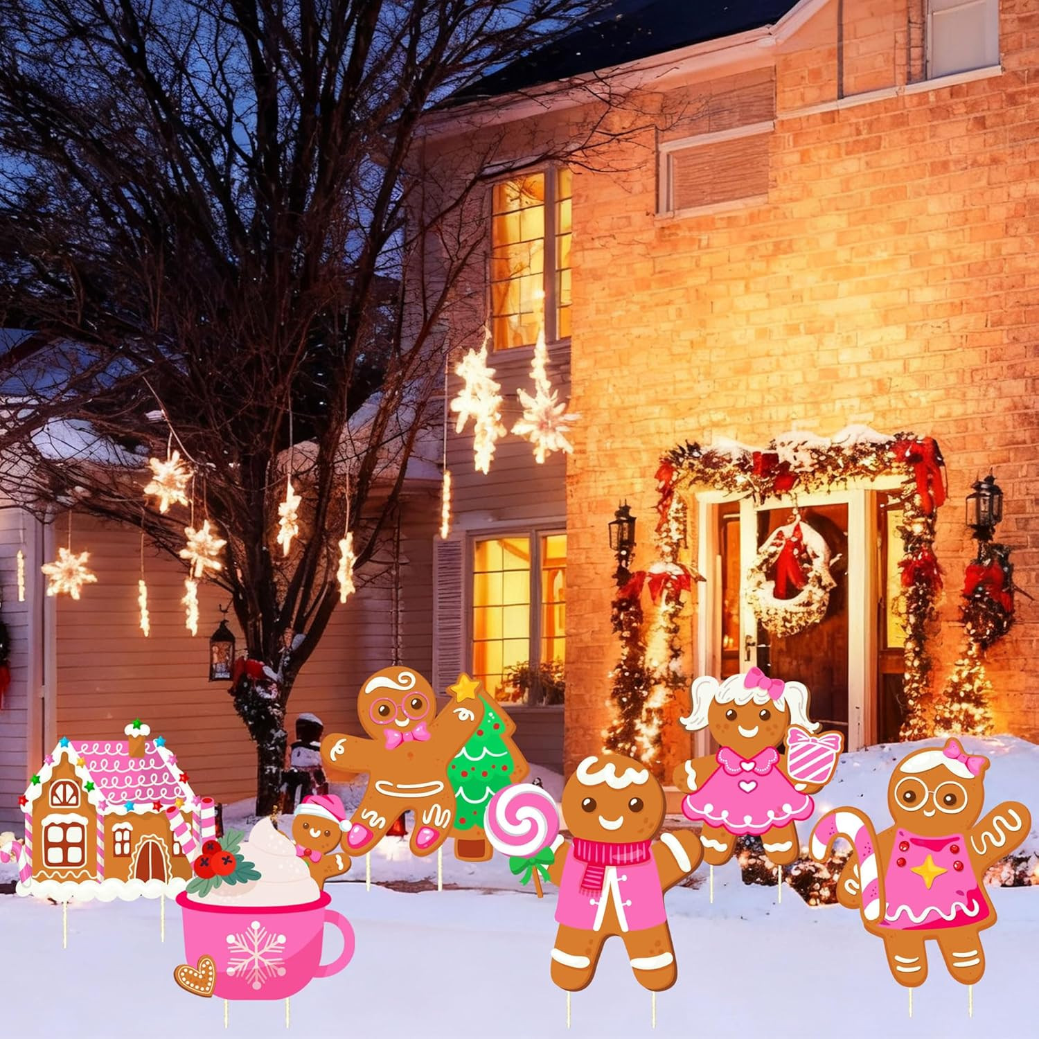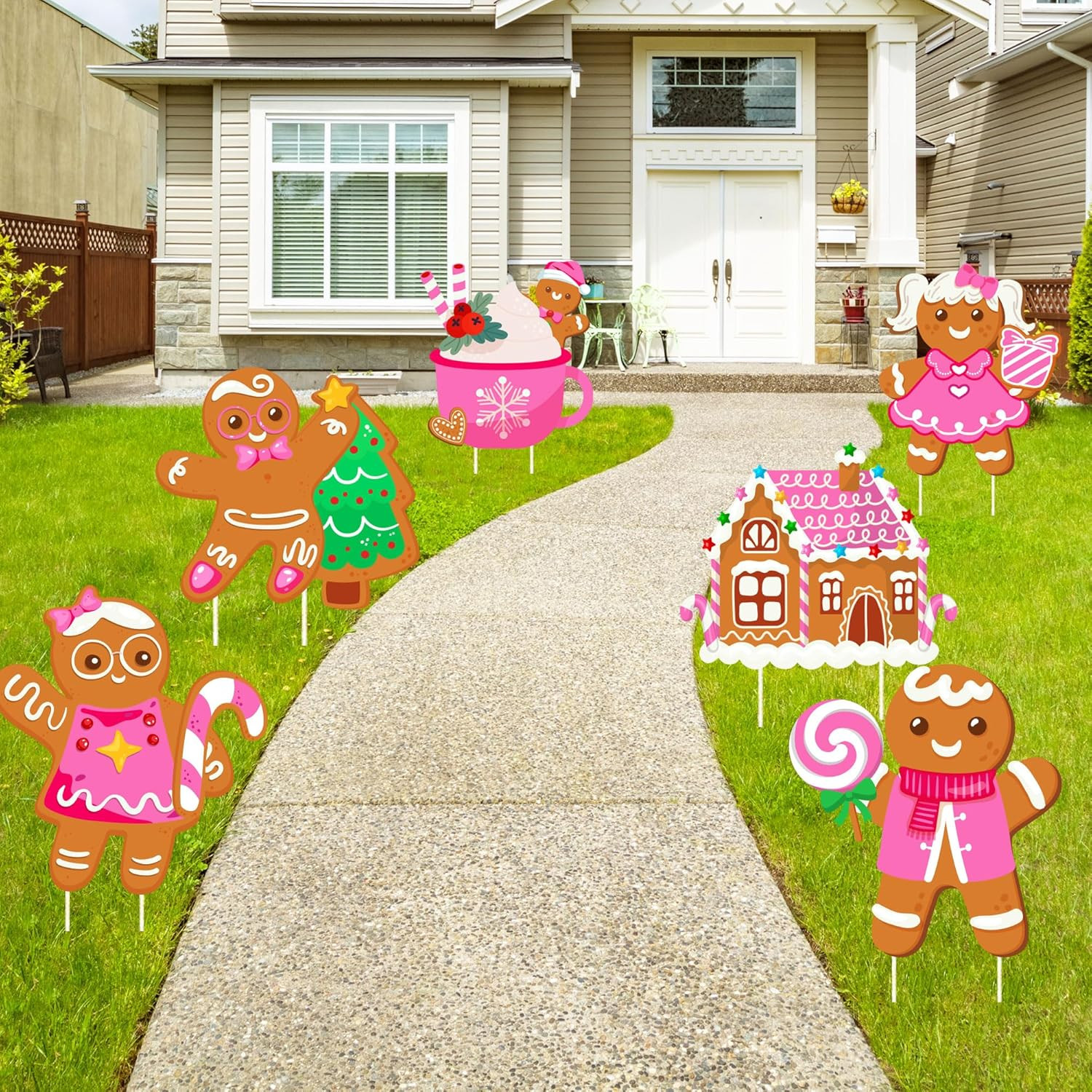 Christmas Gingerbread Man Yard Signs with Stakes Waterproof Pink Gingerbread Man