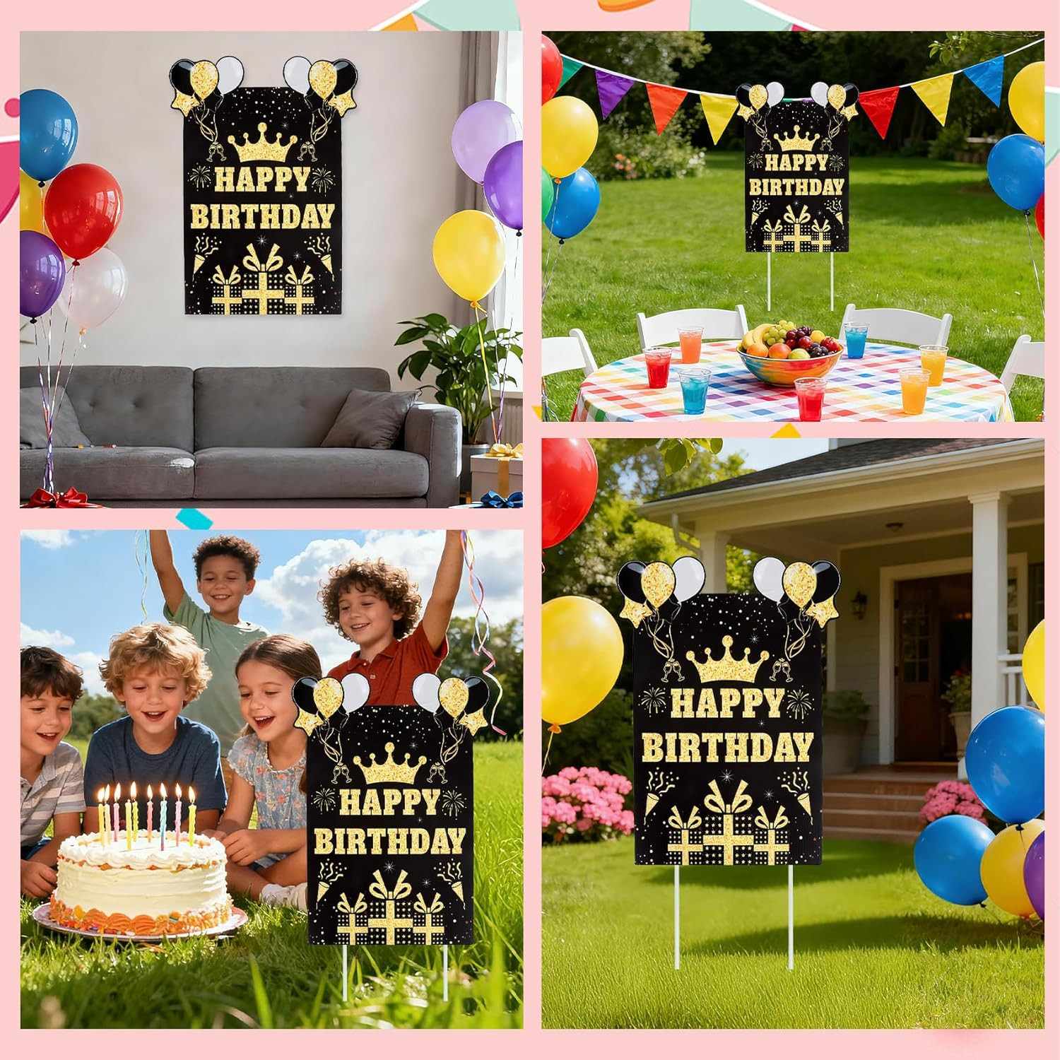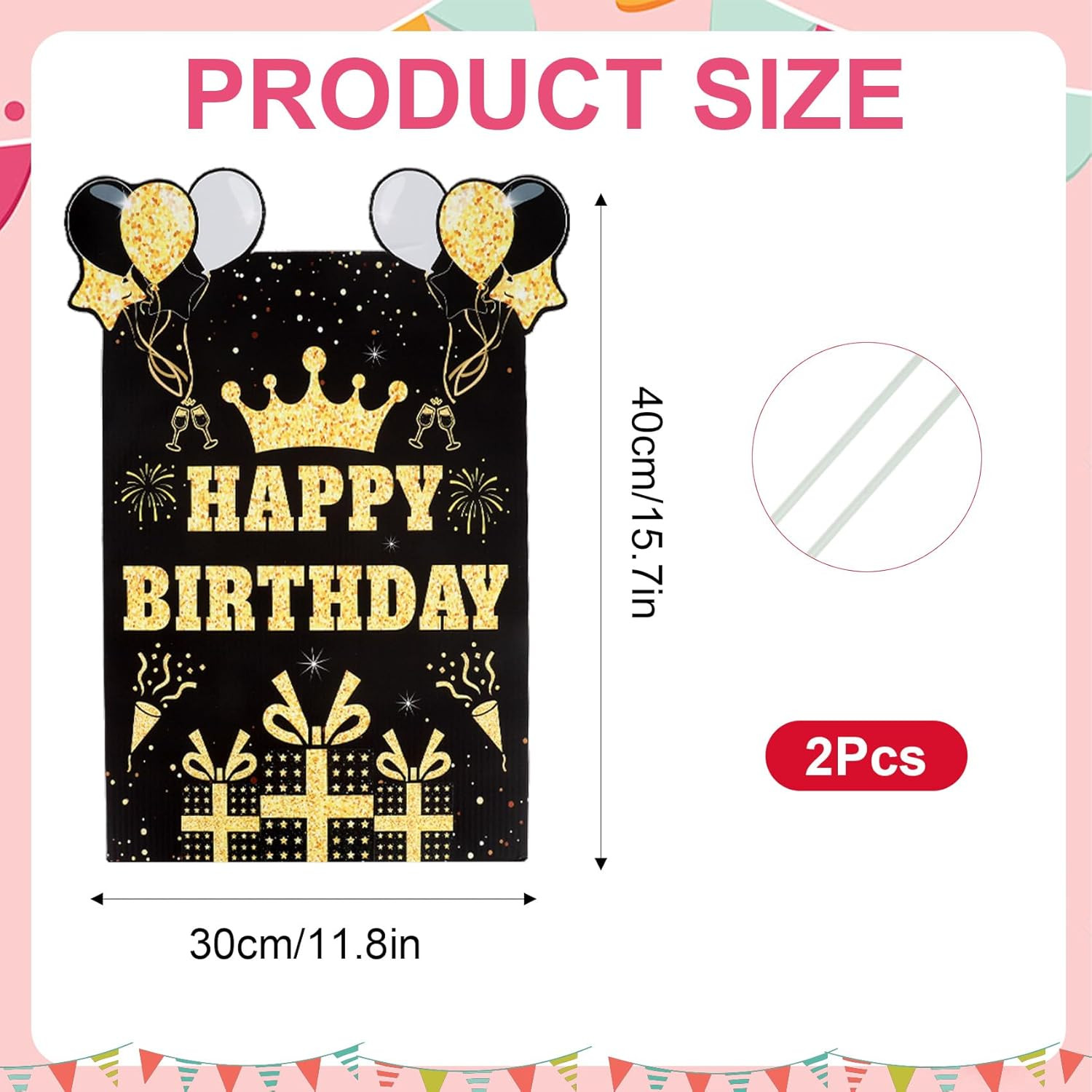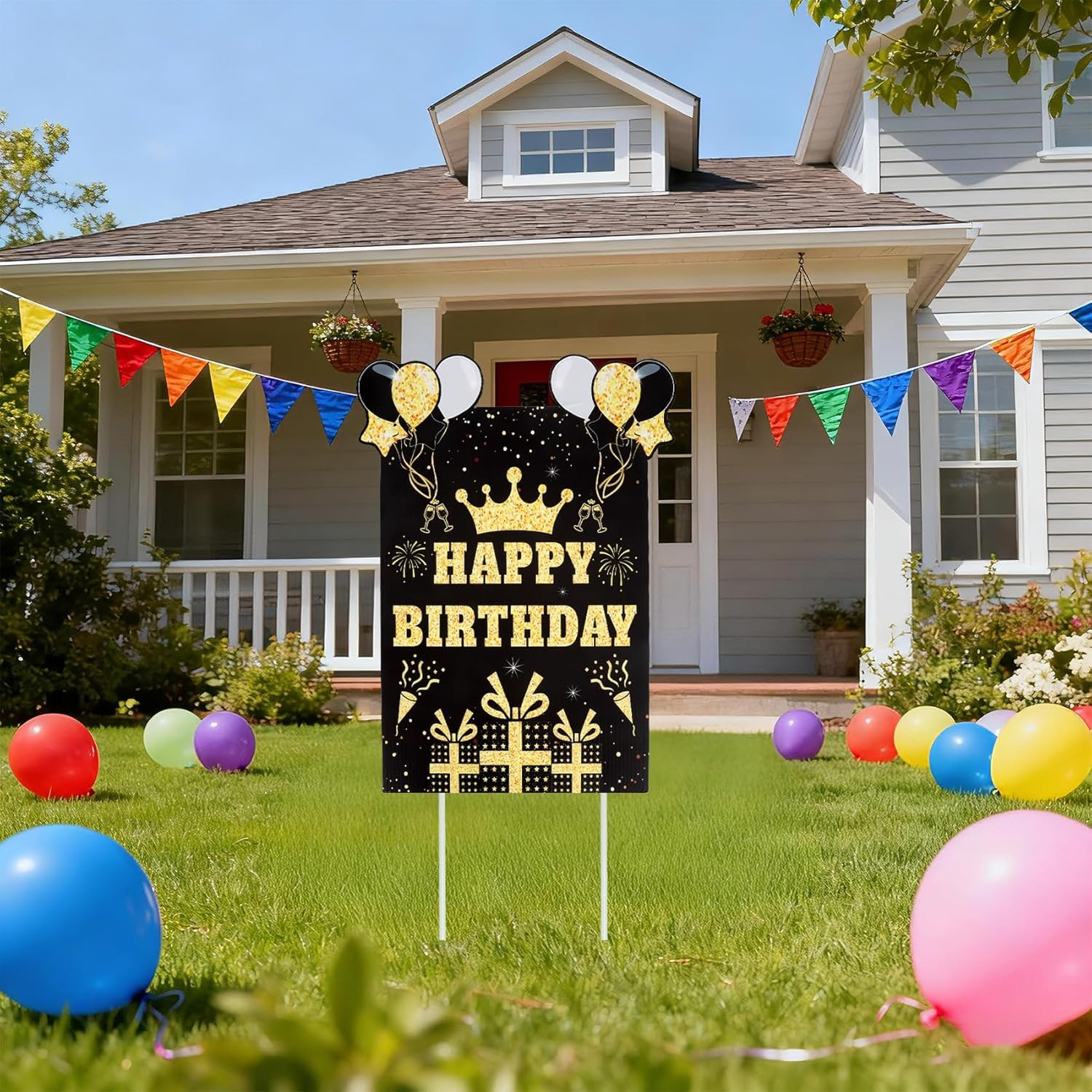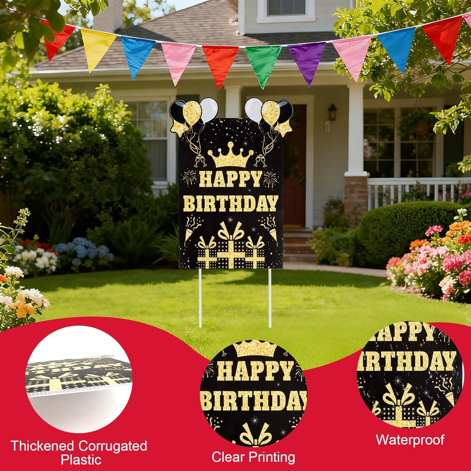 Happy Birthday Yard Sign with Stakes, Black Gold Birthday Yard Sign 11.8 X 15.7