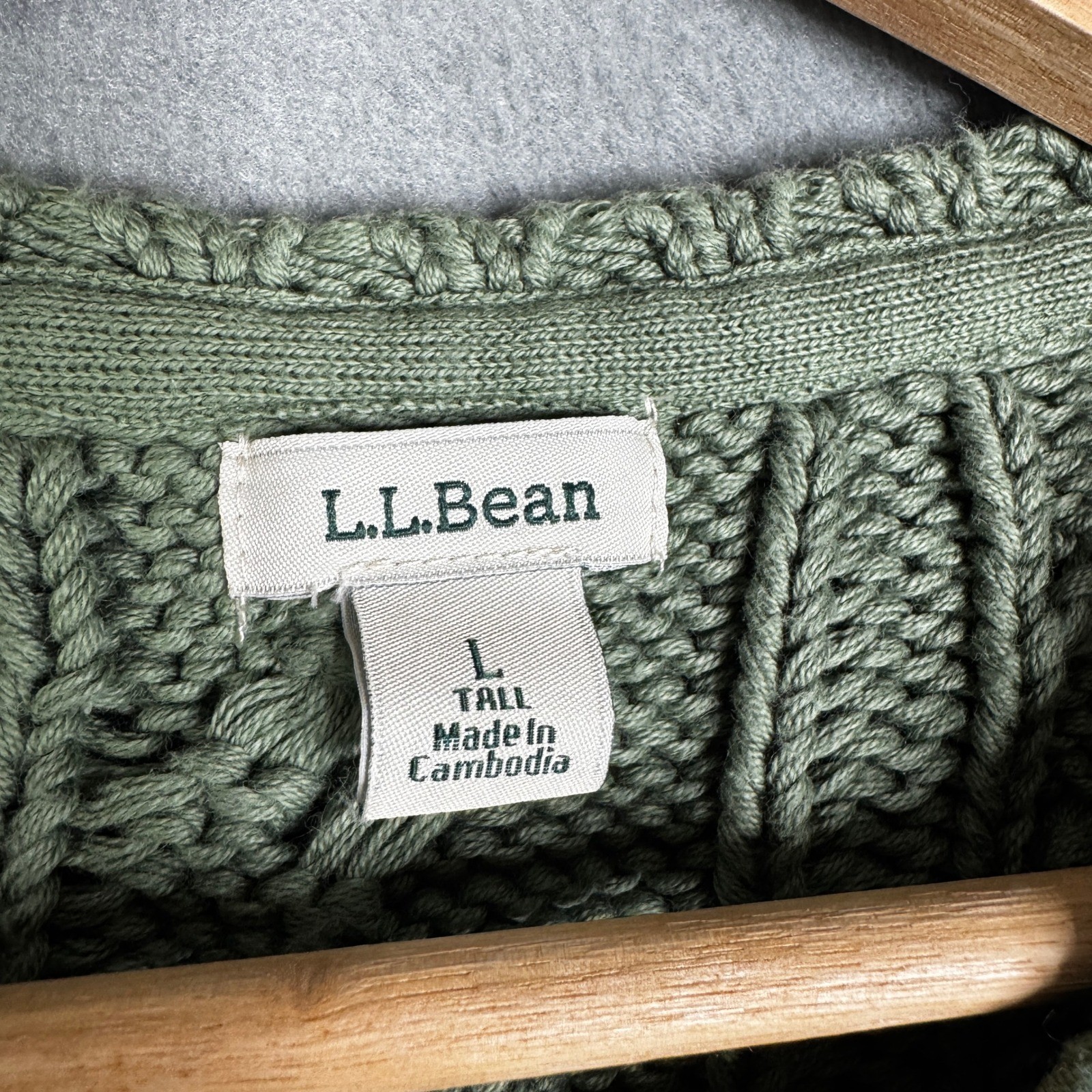 L.L. Bean Cable Knit Sweater Green 100 Cotton Tall Large Crew Neck Long Sleeve