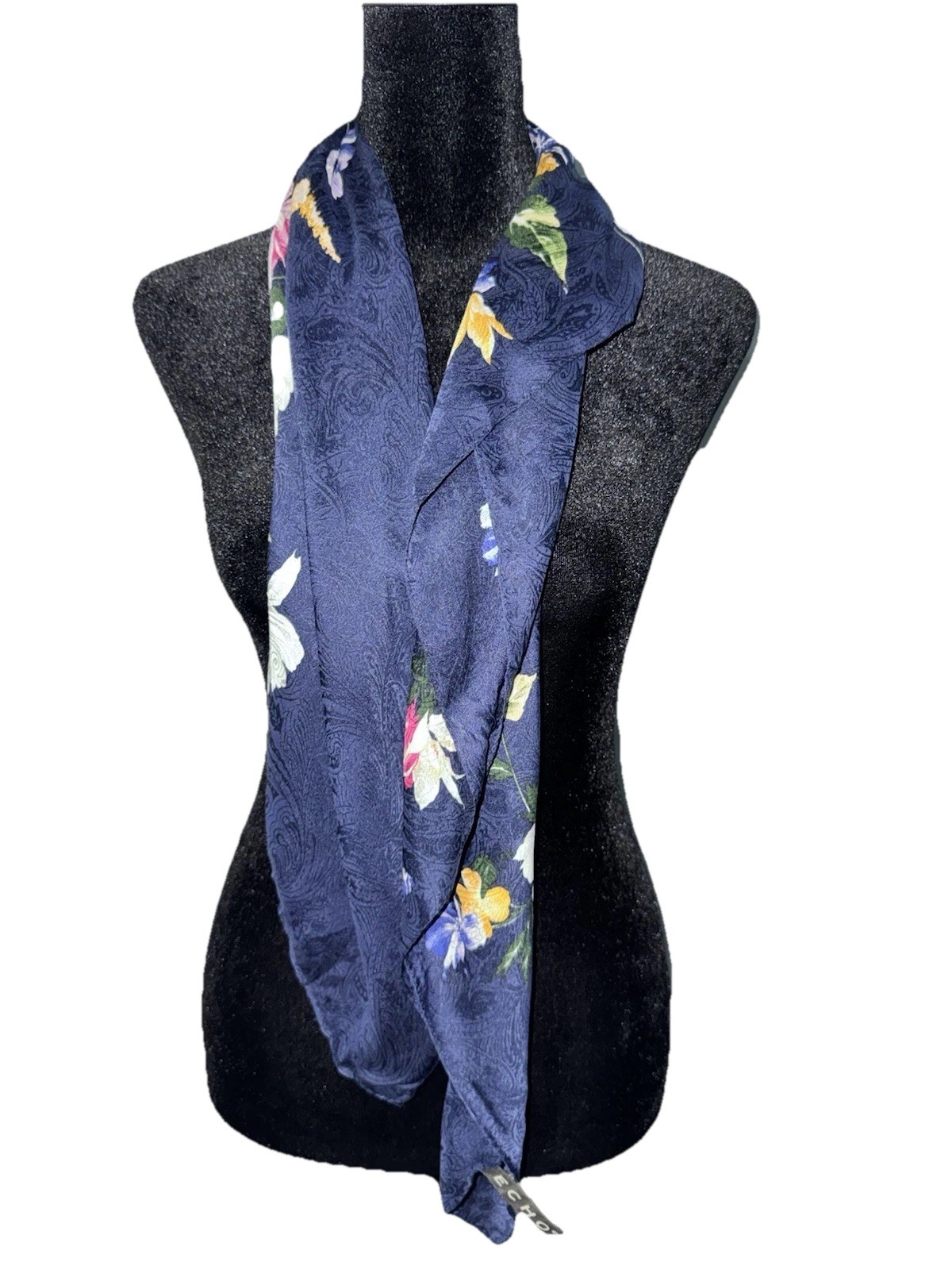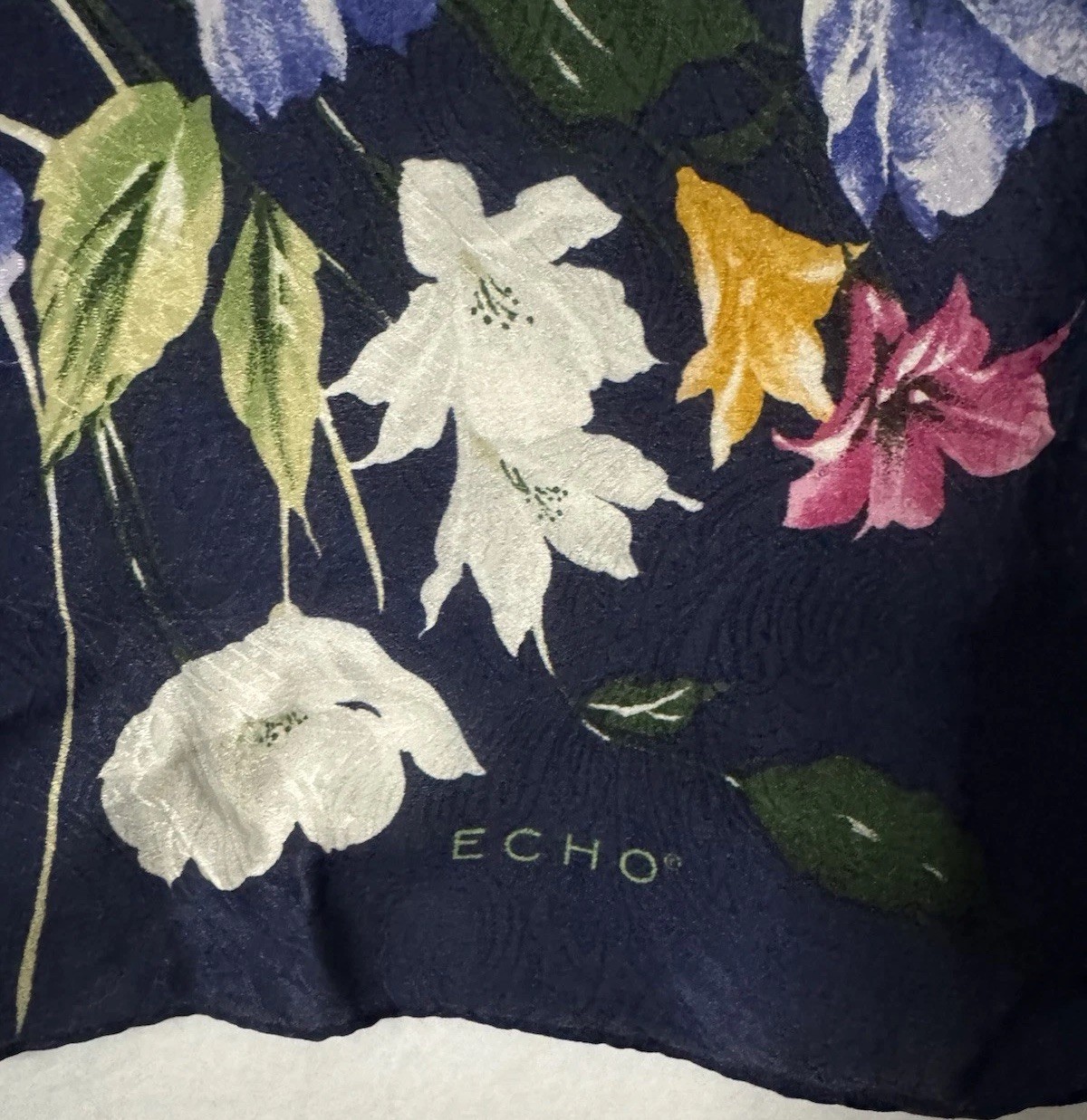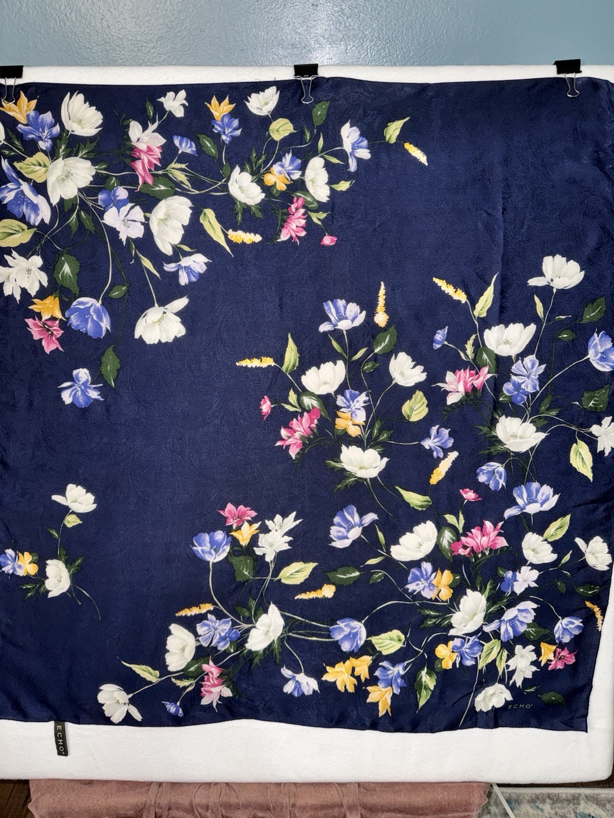 как выглядит Vintage Echo Scarf 100 Silk Rectangle Floral Navy Signed Flowers фото