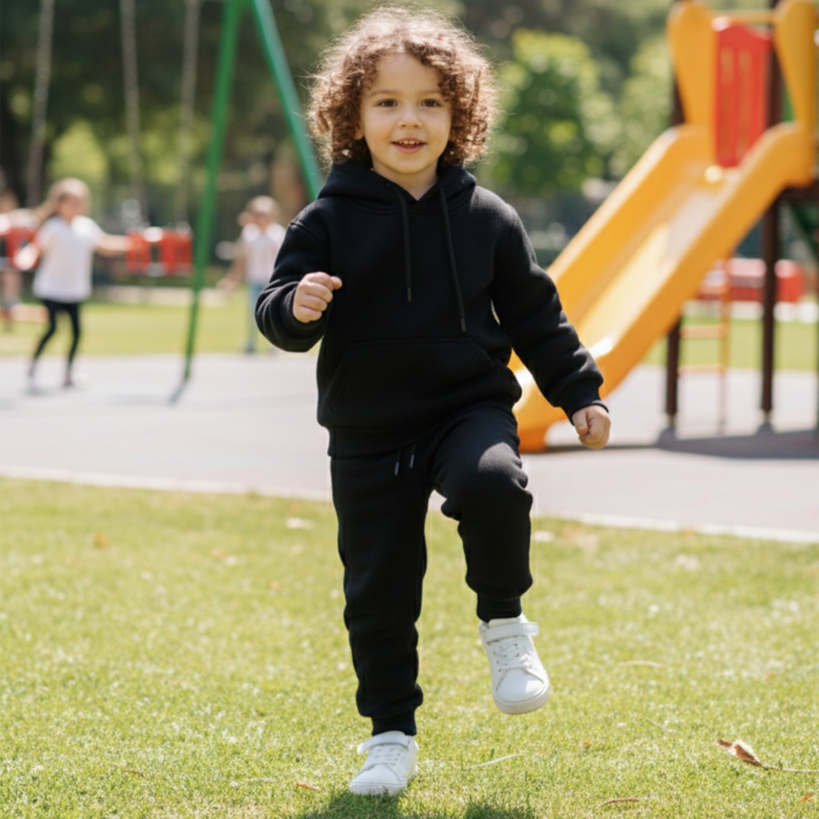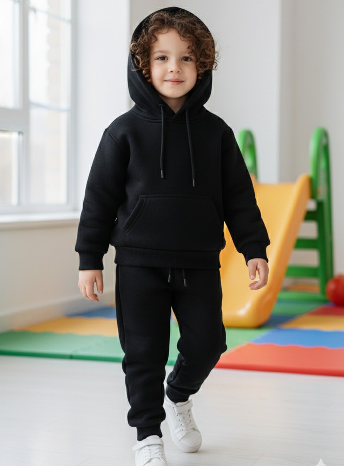как выглядит Kids Black Fleece Tracksuit Hoodie Joggers Set Kangaroo Pocket Pullover unisex фото