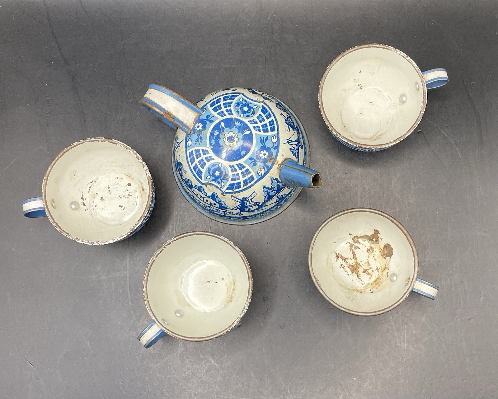 как выглядит Vintage Tin Litho 1940-50s Wolverine Delft 5 Piece Childs Tin Tea Set фото