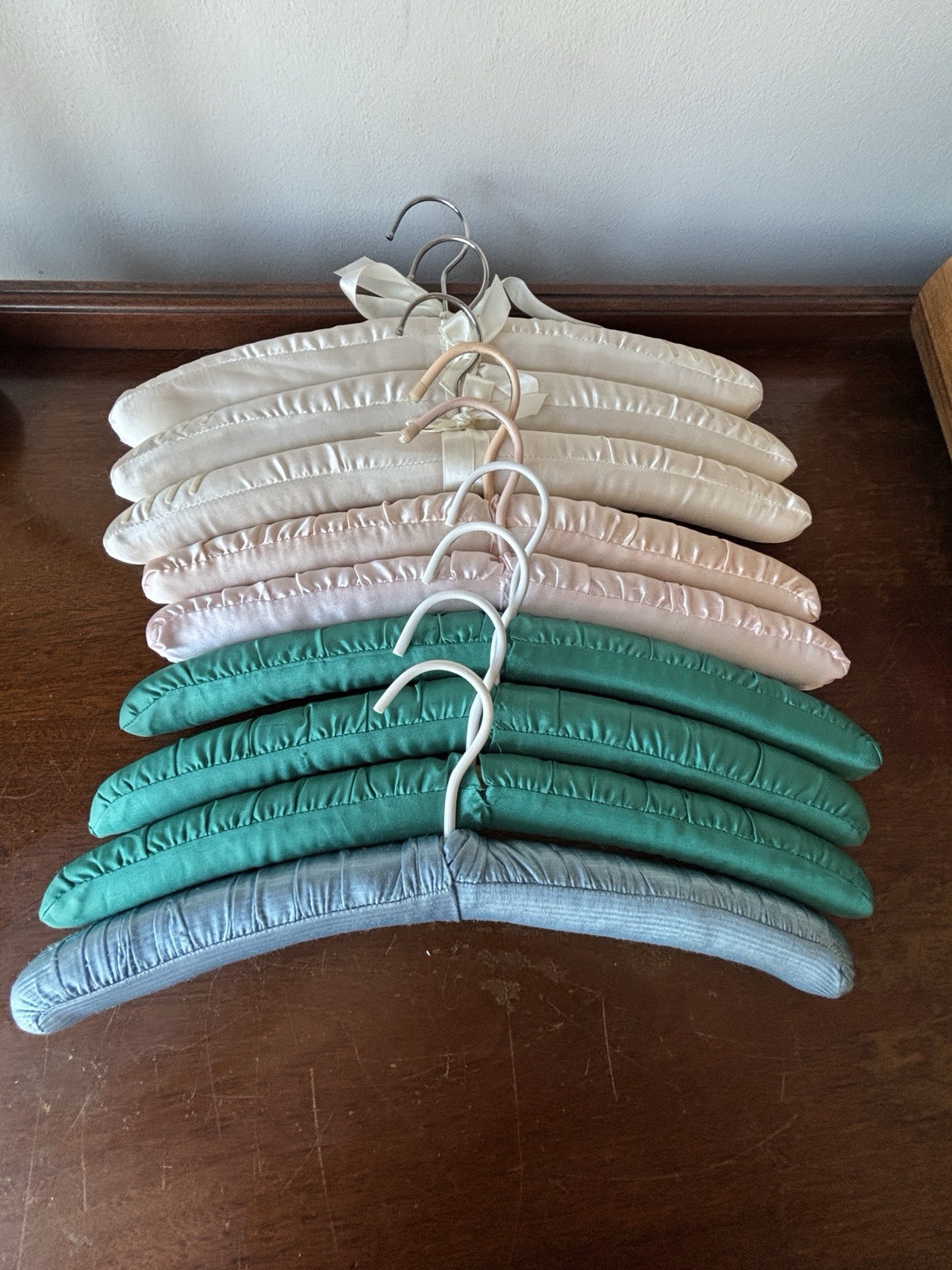 как выглядит 9 Vintage Satin Padded Clothes Hangers Lingerie Boudoir Lot Multicolor фото