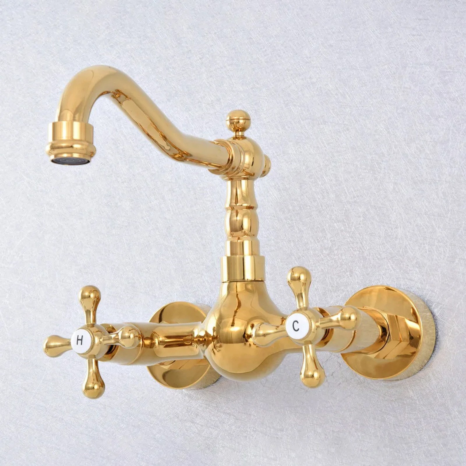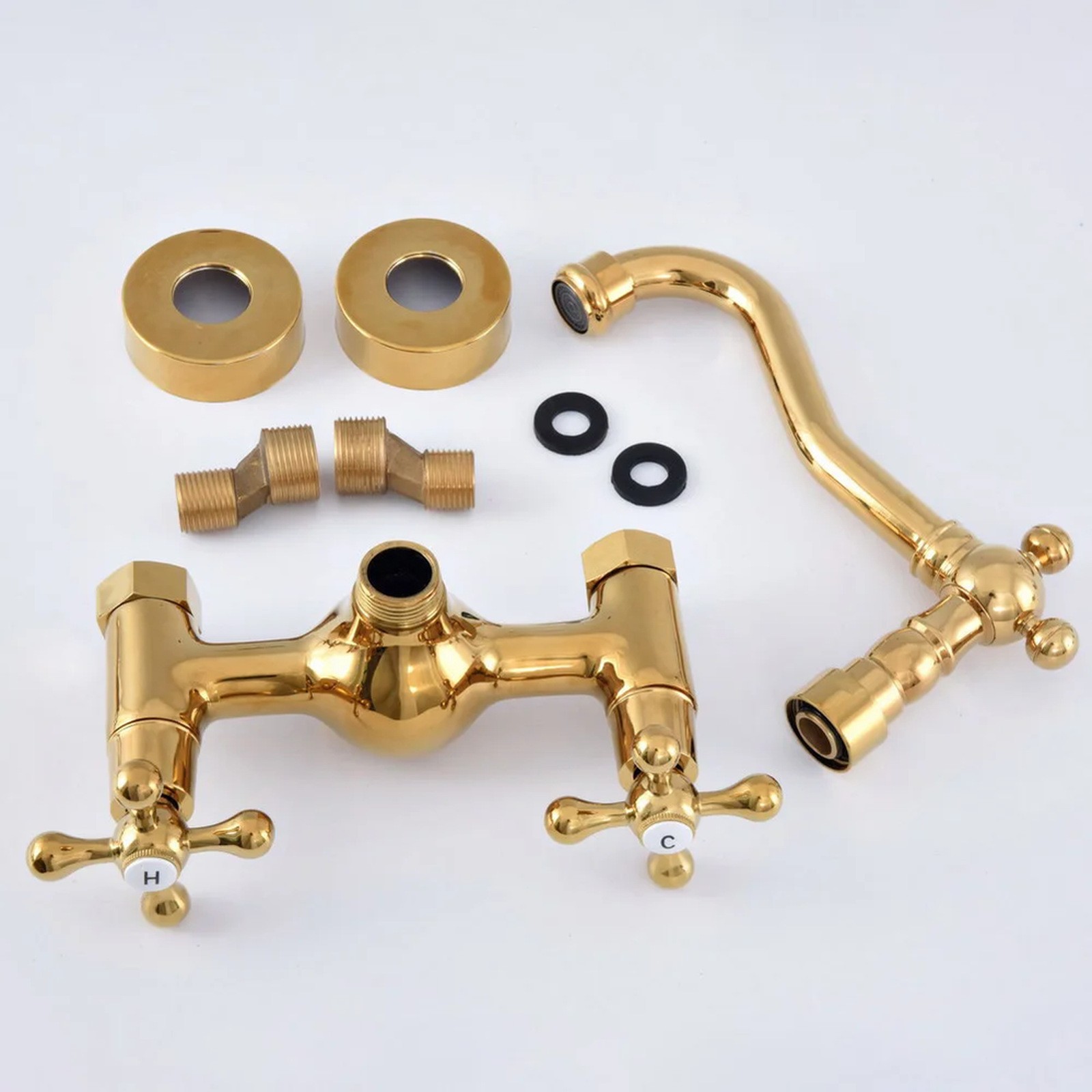 Polished Brass Wall-Mounted Dual-Handle Faucet with Swivel Spout, 2-Hole Install