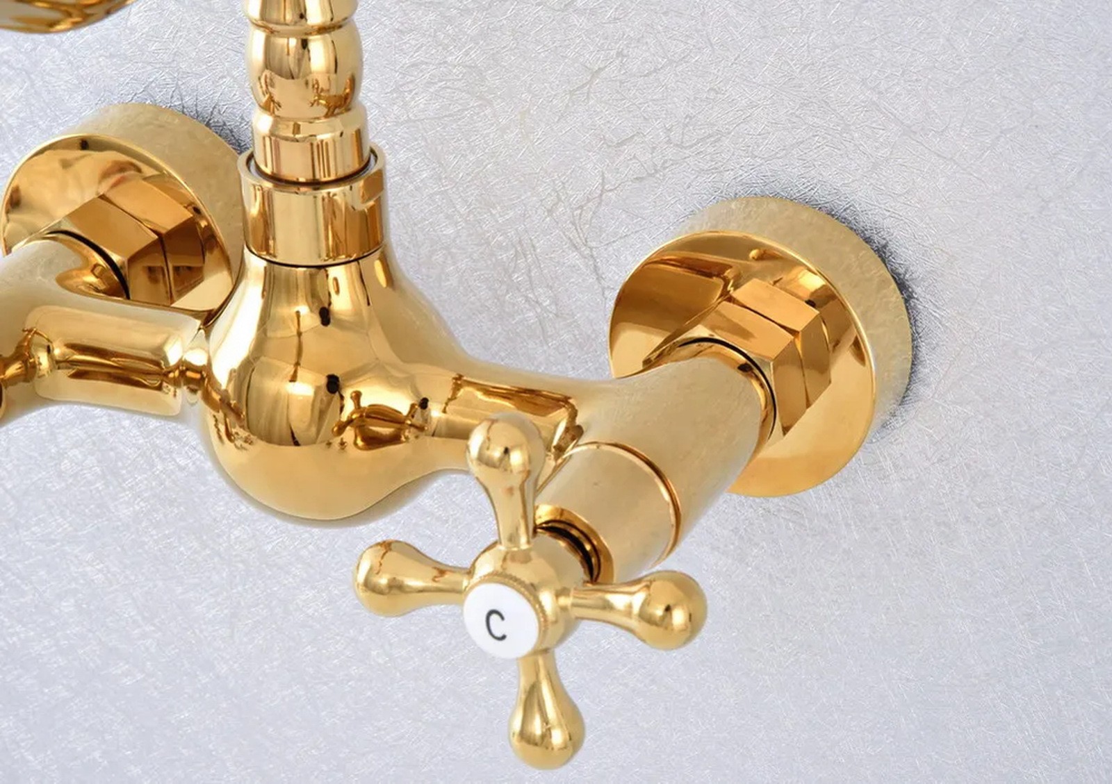 как выглядит Polished Brass Wall-Mounted Dual-Handle Faucet with Swivel Spout, 2-Hole Install фото