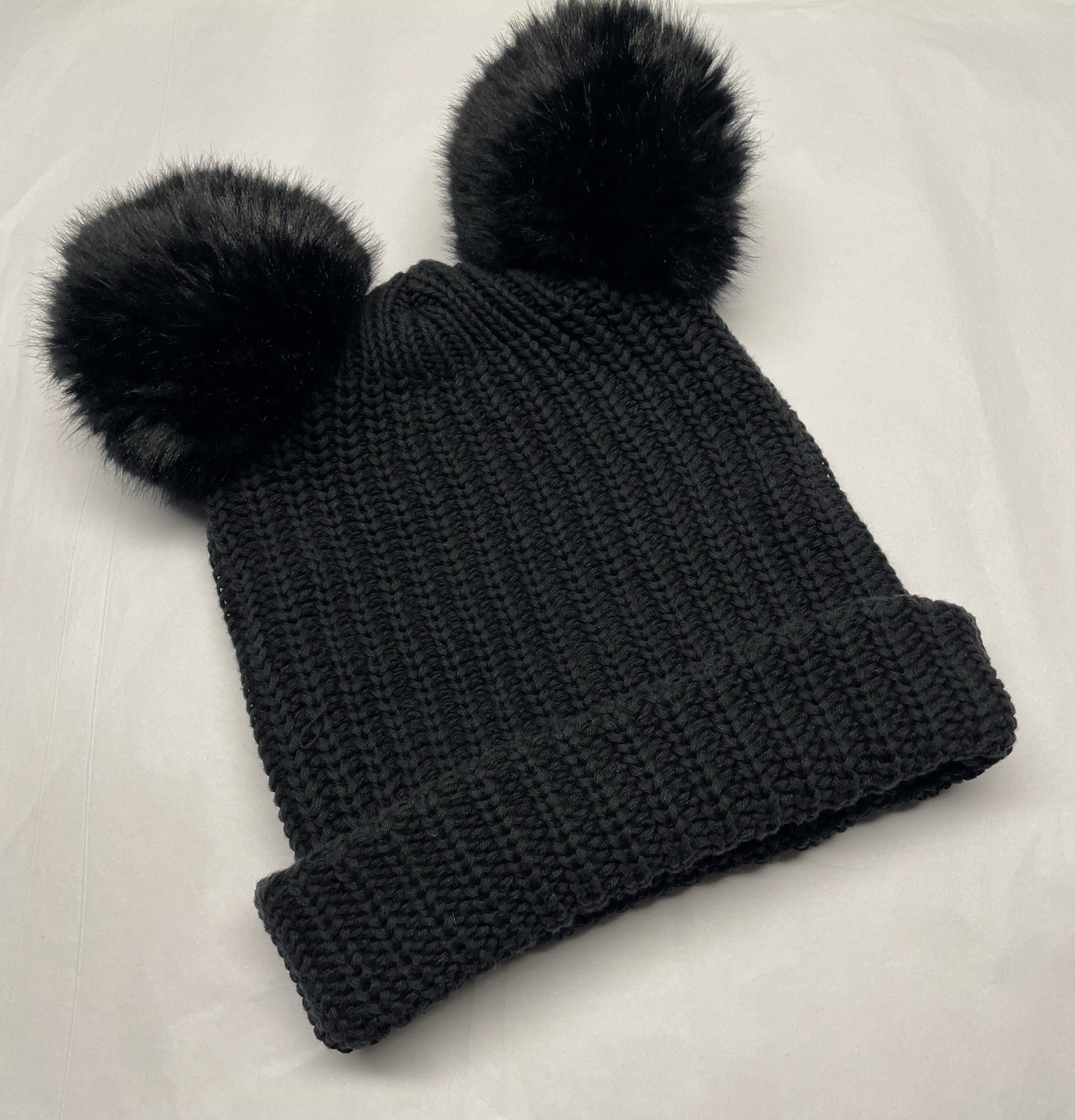 Love Your Melon LYM Black Double Pom Knit Cuffed Classic Beanie Hat