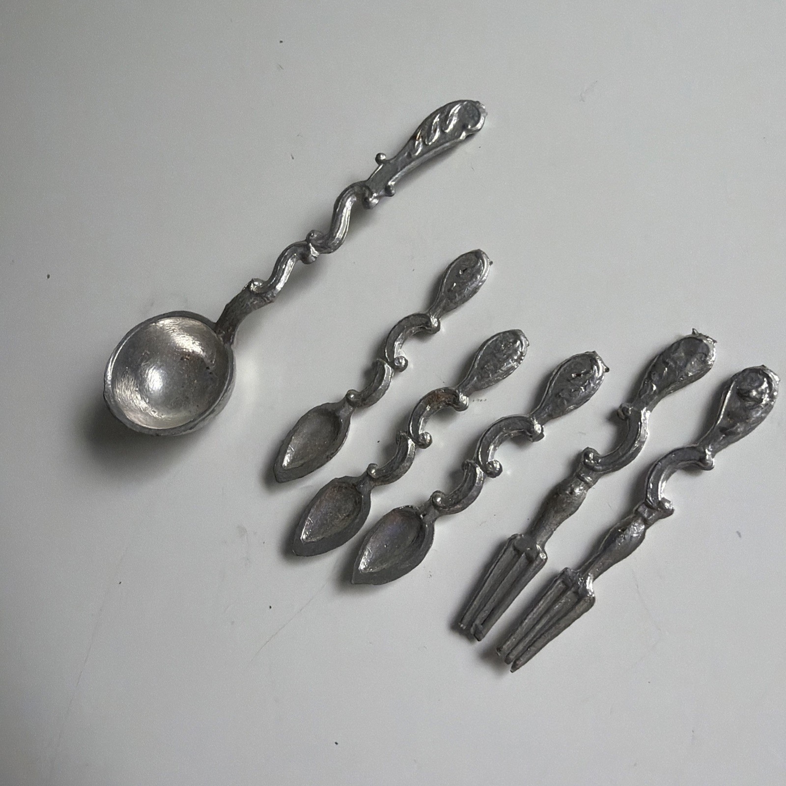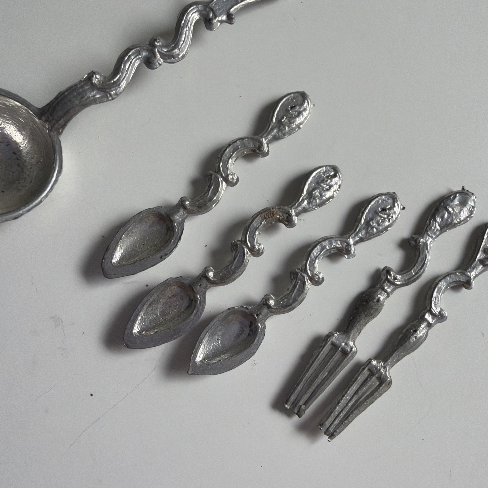 • VIntage JAB Dollhouse Silverware Set Ladle Spoon Fork Silver Metal Lot Part Mini