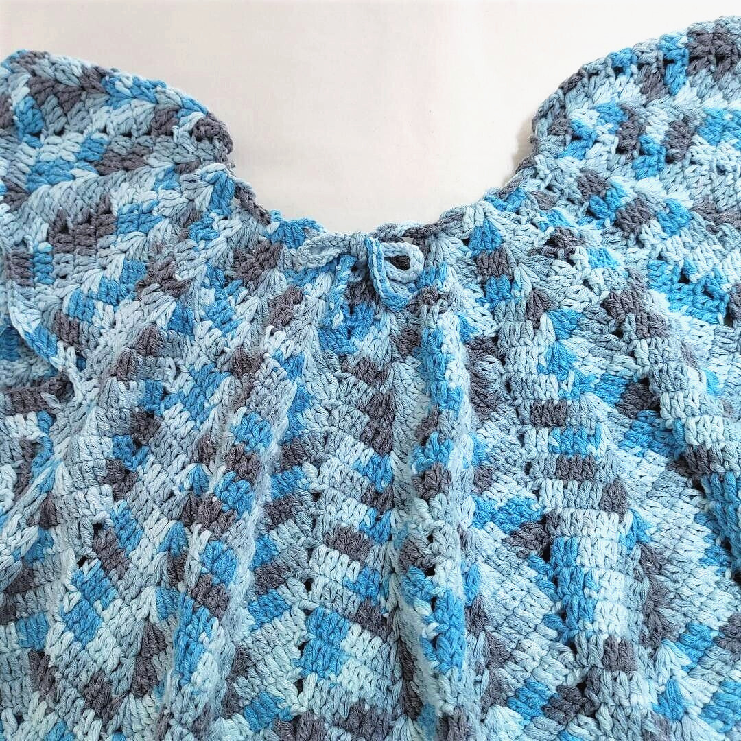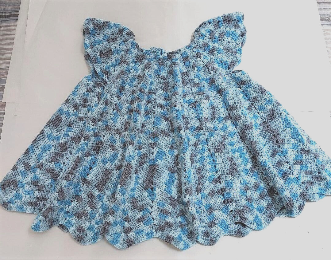 как выглядит Hand Crocheted One Size Shirley Temple Swing Dress Flutter Sleeves Pointelle Hem фото