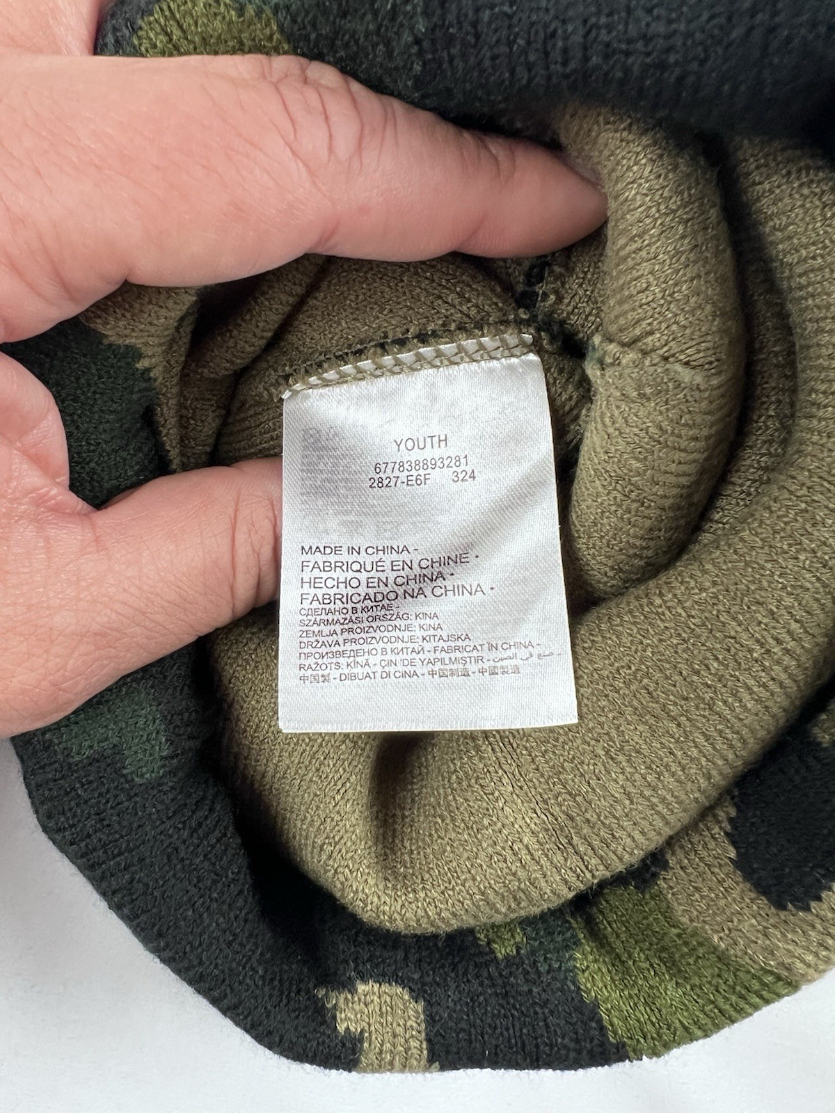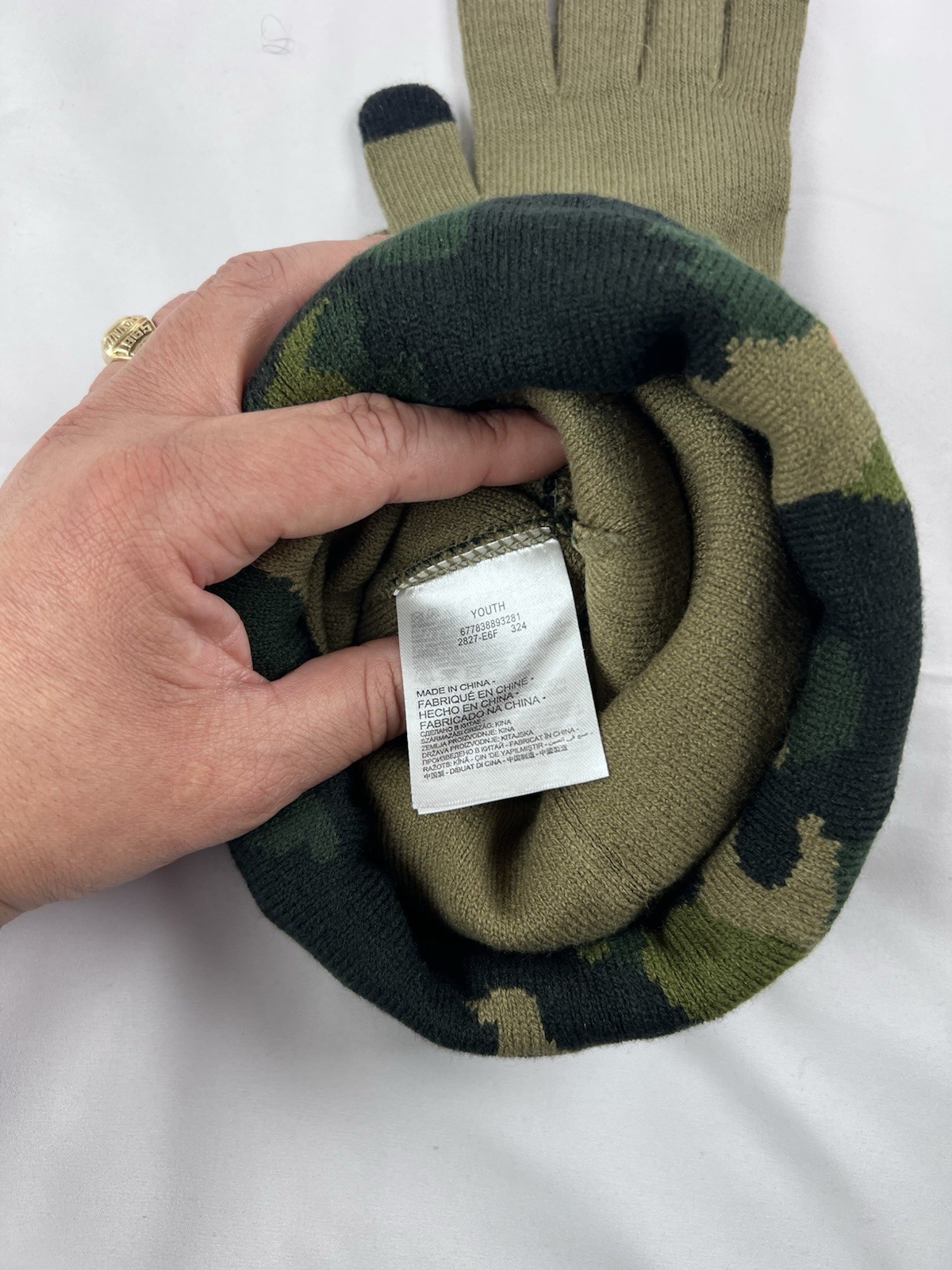 как выглядит Nike Youth 2-Piece Hat Gloves Set Camo Olive Pom Beanie NWT фото