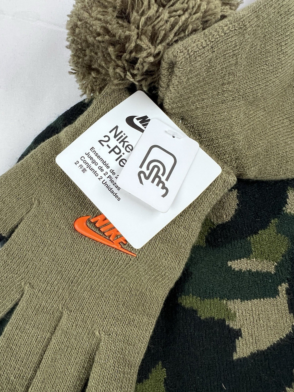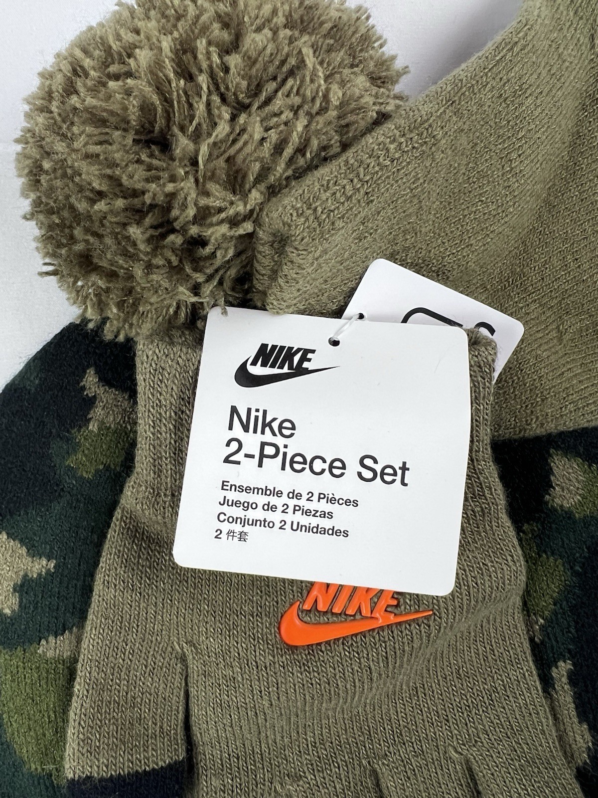 Nike Youth 2-Piece Hat Gloves Set Camo Olive Pom Beanie NWT