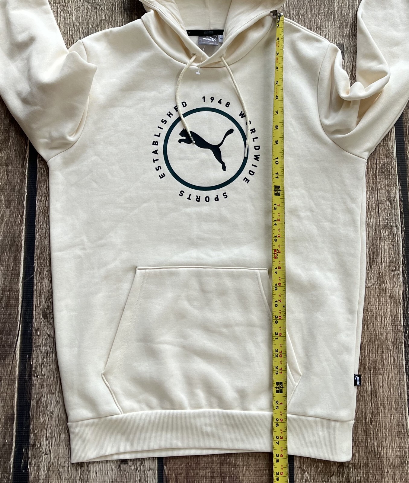 PUMA SOFT TOUCH FLEECE PULLOVER GRAPHIC LOGO HOODIE CREAM MENS SMALL NEW NWOT