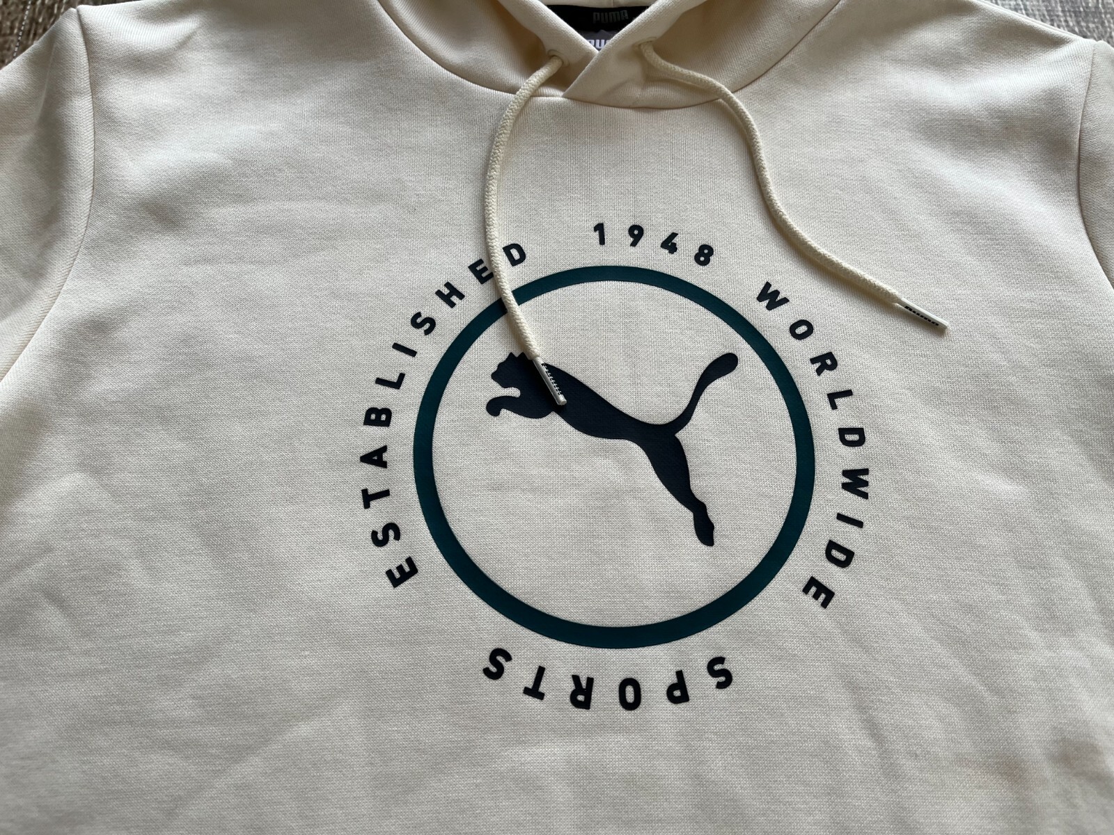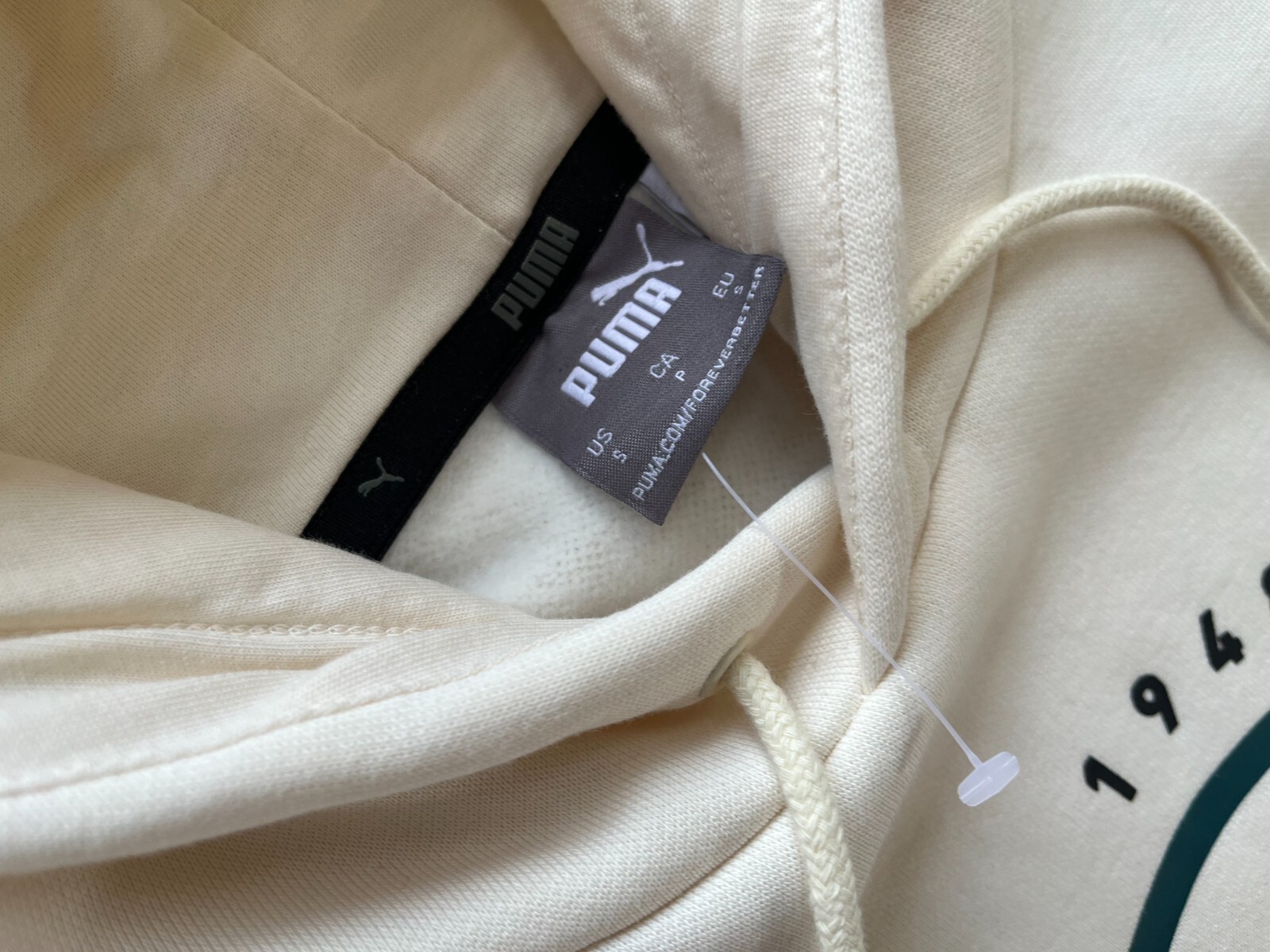 как выглядит PUMA SOFT TOUCH FLEECE PULLOVER GRAPHIC LOGO HOODIE CREAM MENS SMALL NEW NWOT фото