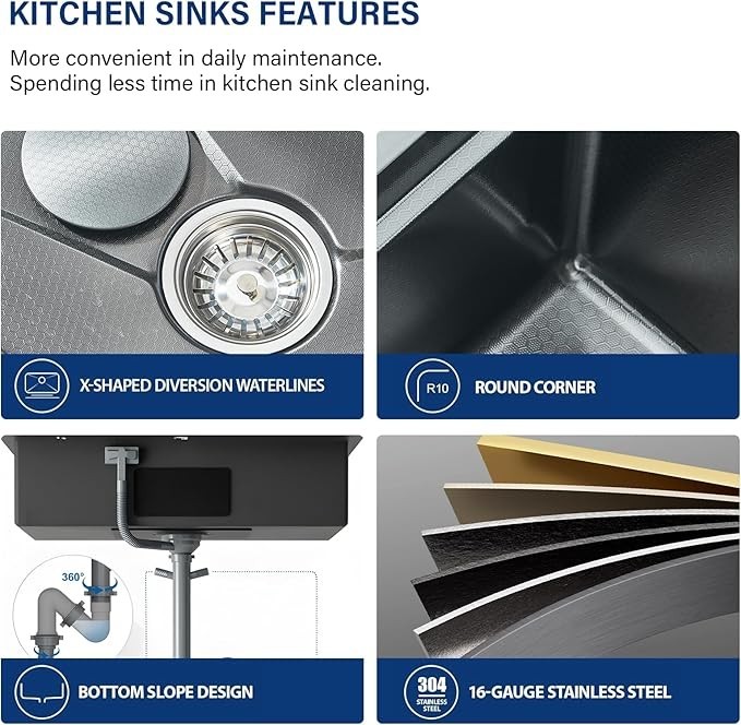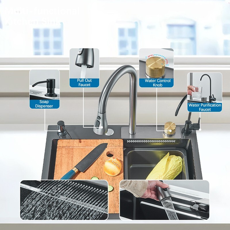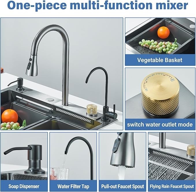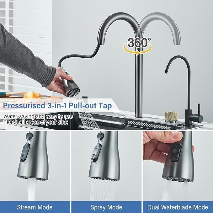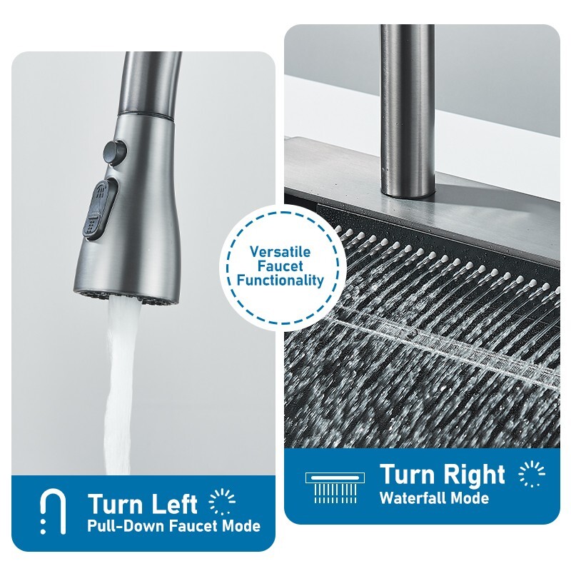 Stainless Steel Flying Rain Waterfall Kitchen Sink Single Bowl W/Pull Out Faucet