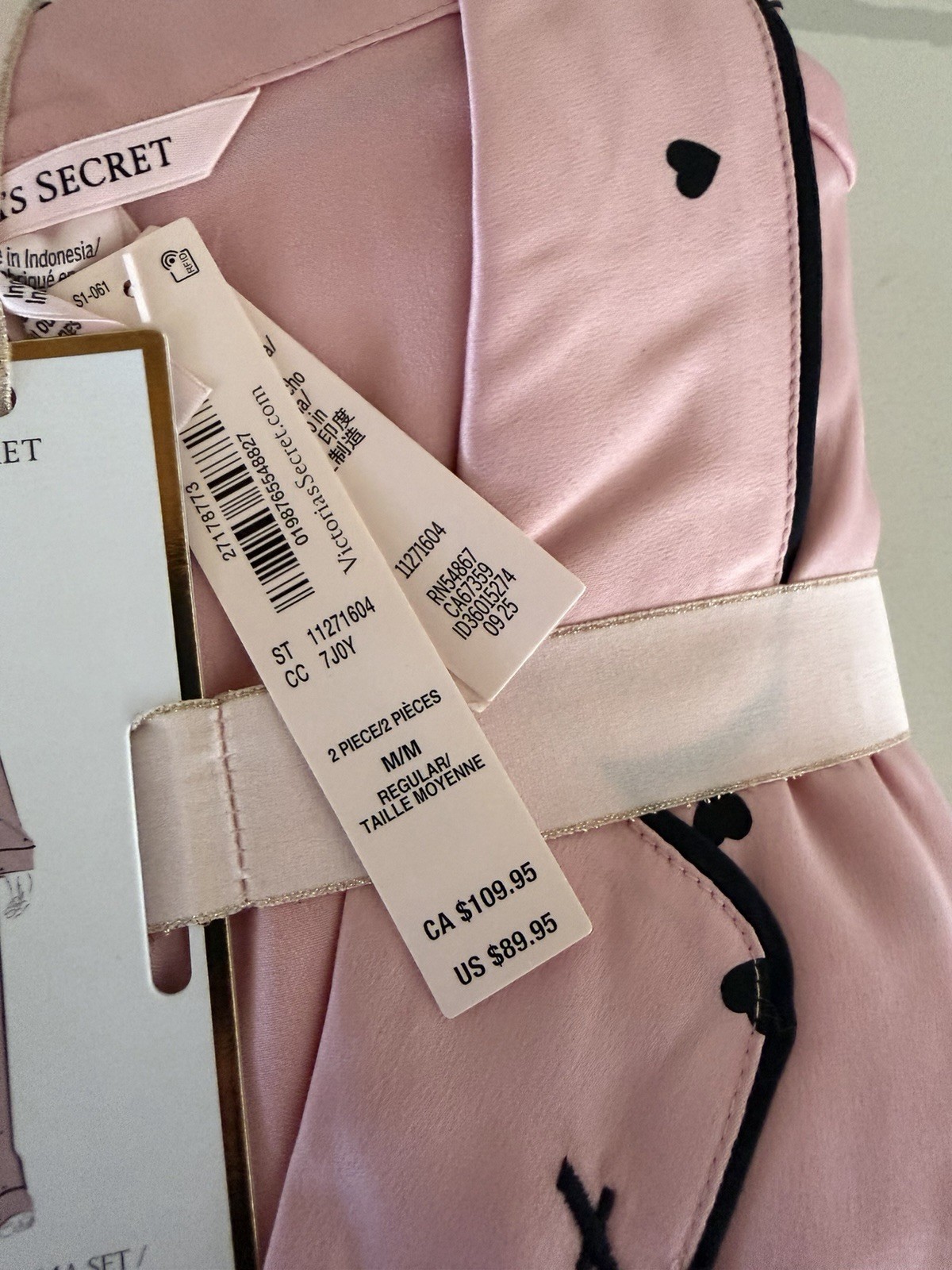 Victoria's Secret Women's Pajama Set Pink Satin Black Hearts Trim Medium NWT