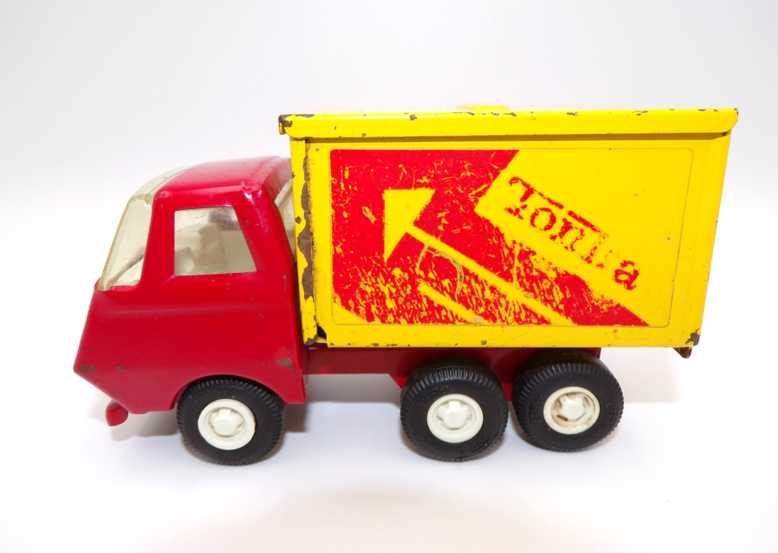 Vintage Tonka Miniature Delivery Box Dump Truck Red Yellow Arrow 1970's