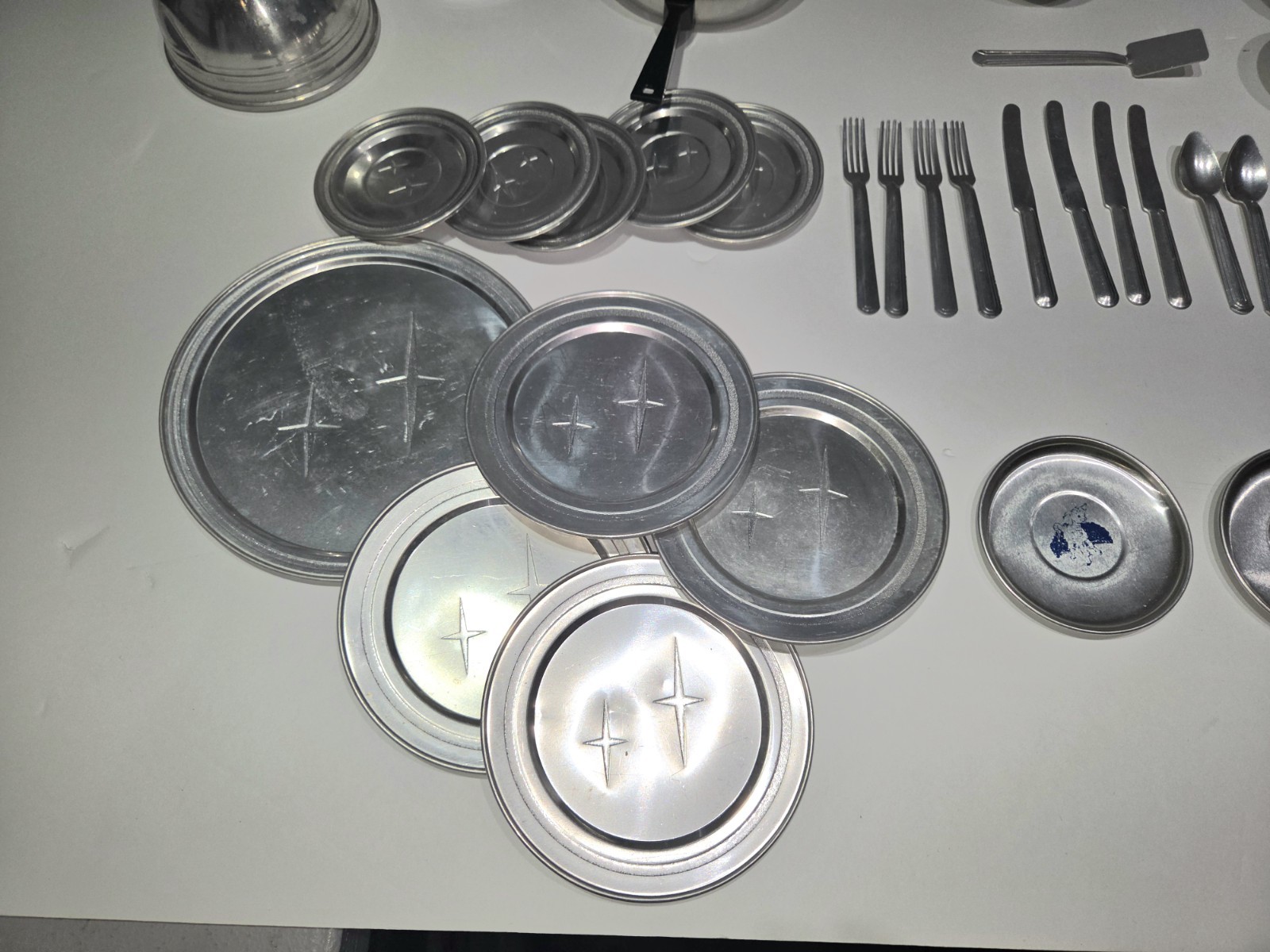 как выглядит Vintage Aluminum Childs Kitchen Cups Utensils Pans Coffee Tea Plate Set Lot фото