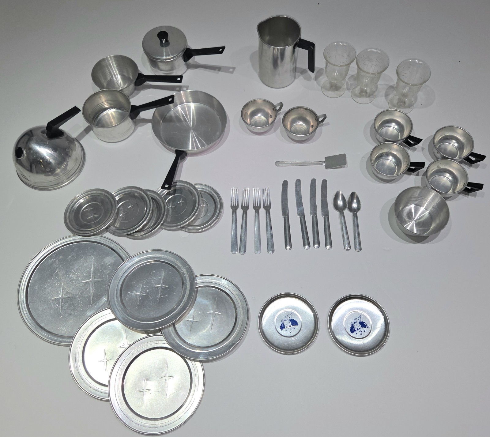 Vintage Aluminum Childs Kitchen Cups Utensils Pans Coffee Tea Plate Set Lot