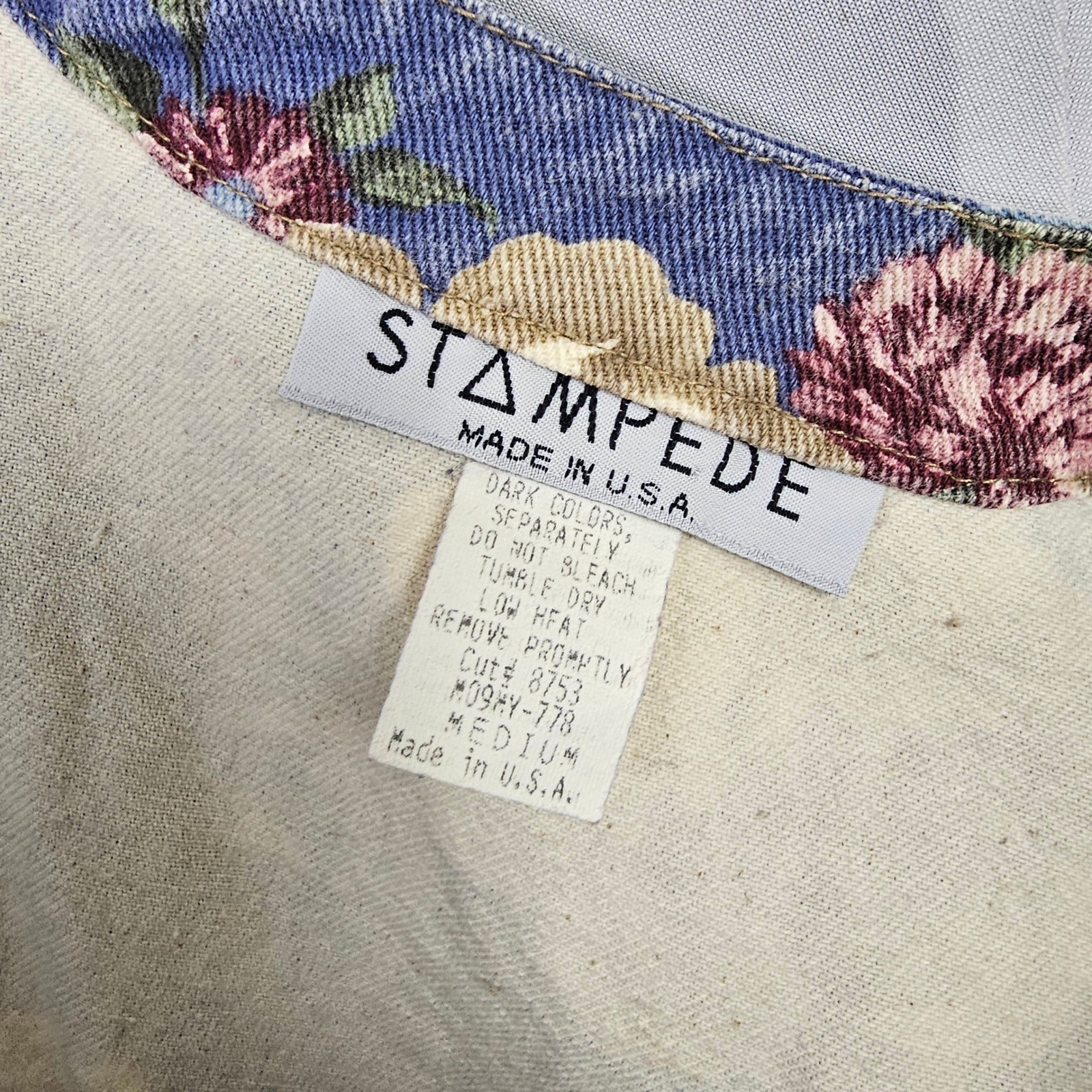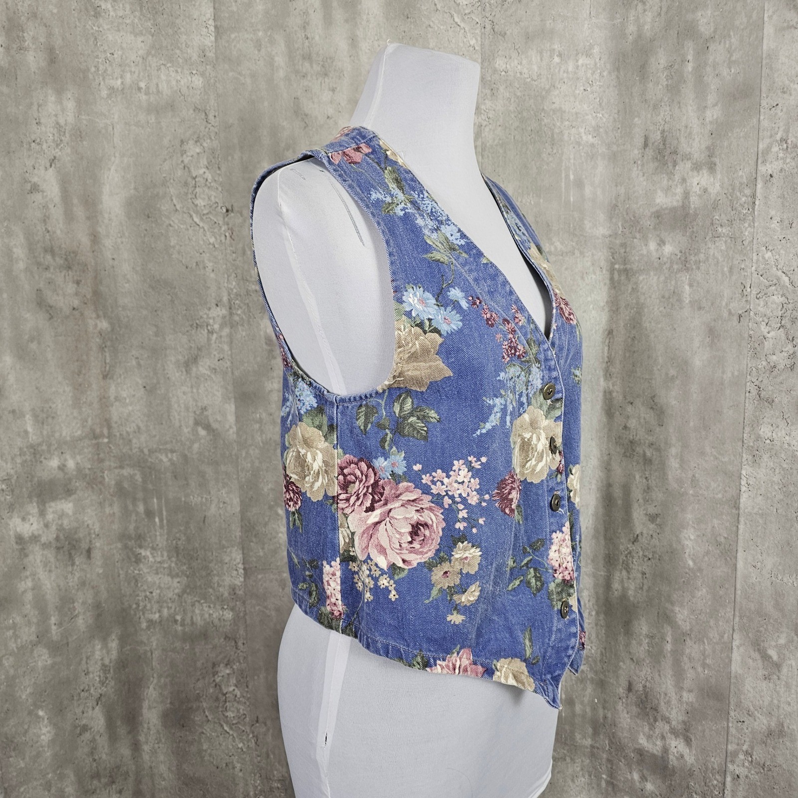 Vintage 90s Stampede USA Size M Blue Floral Denim Button Front Vest Cottagecore