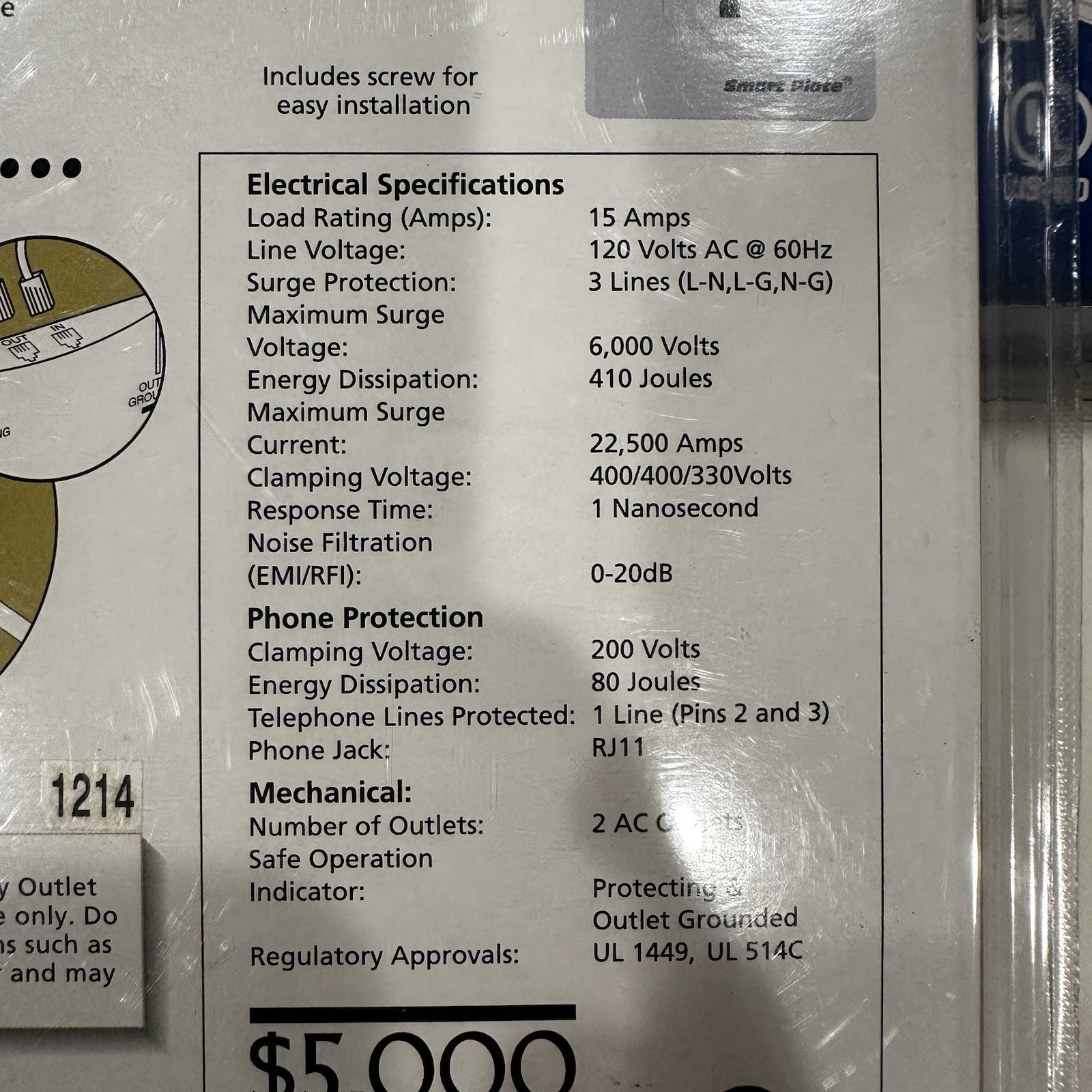 RCA Smart Plate Surge Protector SPT300 410J 2 Outlets 6ft Phone/Data Line FOR 1
